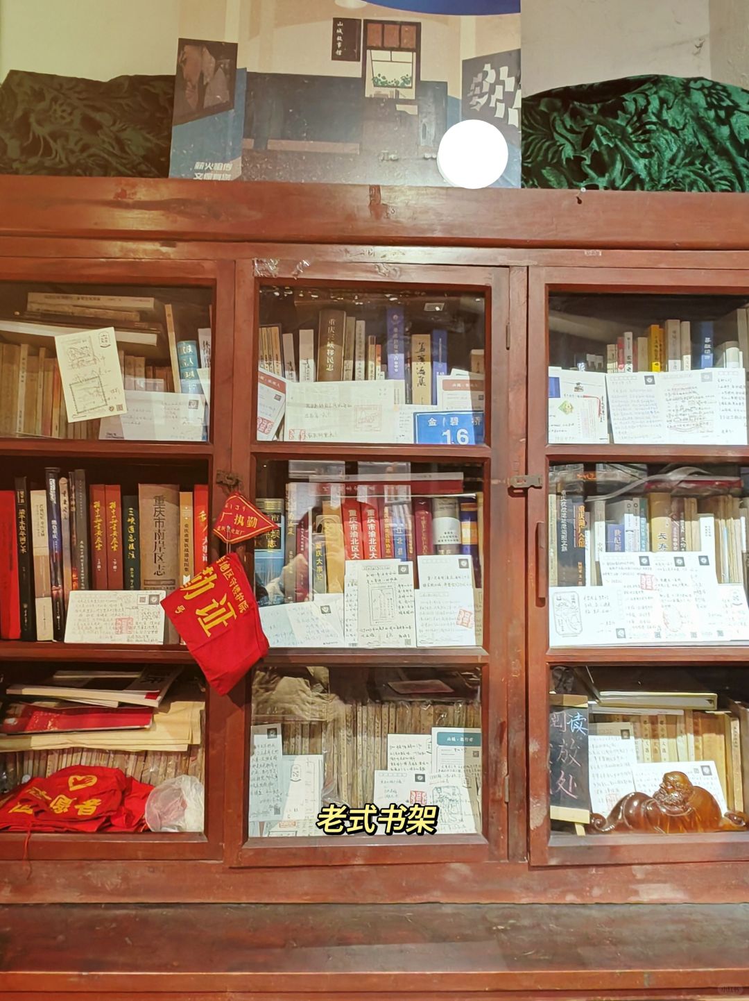 5.山城时光里图书馆,1楼有一间老教室,里面的陈设也很老,是那种纯木质的桌椅,是80、90后满满的回忆,图书馆里还有一间专门摆放老物件的房间,回忆感也满满。
