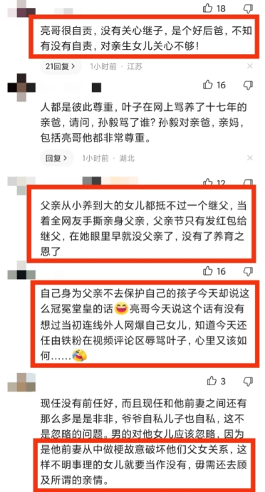 继昨日缺乏安全感的儿子孙毅前来质问母亲,会不会不管自己?此言一出,网友们倍感心酸,亮哥也心生怜悯,感觉这孩子太可怜了,联想到亮嫂对自己的儿子王雨涵照顾有加,而作为继父的他却忽略了对继子的爱,非常自责。为表诚意,亮哥还跑回老家和父亲促膝长谈,劝诫老人要将心比心,对孩子们要一视同仁。 视频一出,立刻引发众网友热议,战火集中到亮哥的亲生女儿叶子身上,有网友直怼:亮哥很自责,没有关心继子,是个好后爸,不知有没有自责,对亲生女儿关心不够!但立马又遭到其他网友的回怼:叶子不尊重亲生父亲,当着全网友的面手撕亲爹,父亲节也只发红包给继父,一点都没有顾及父亲对她的养育之恩,非常不明事理。