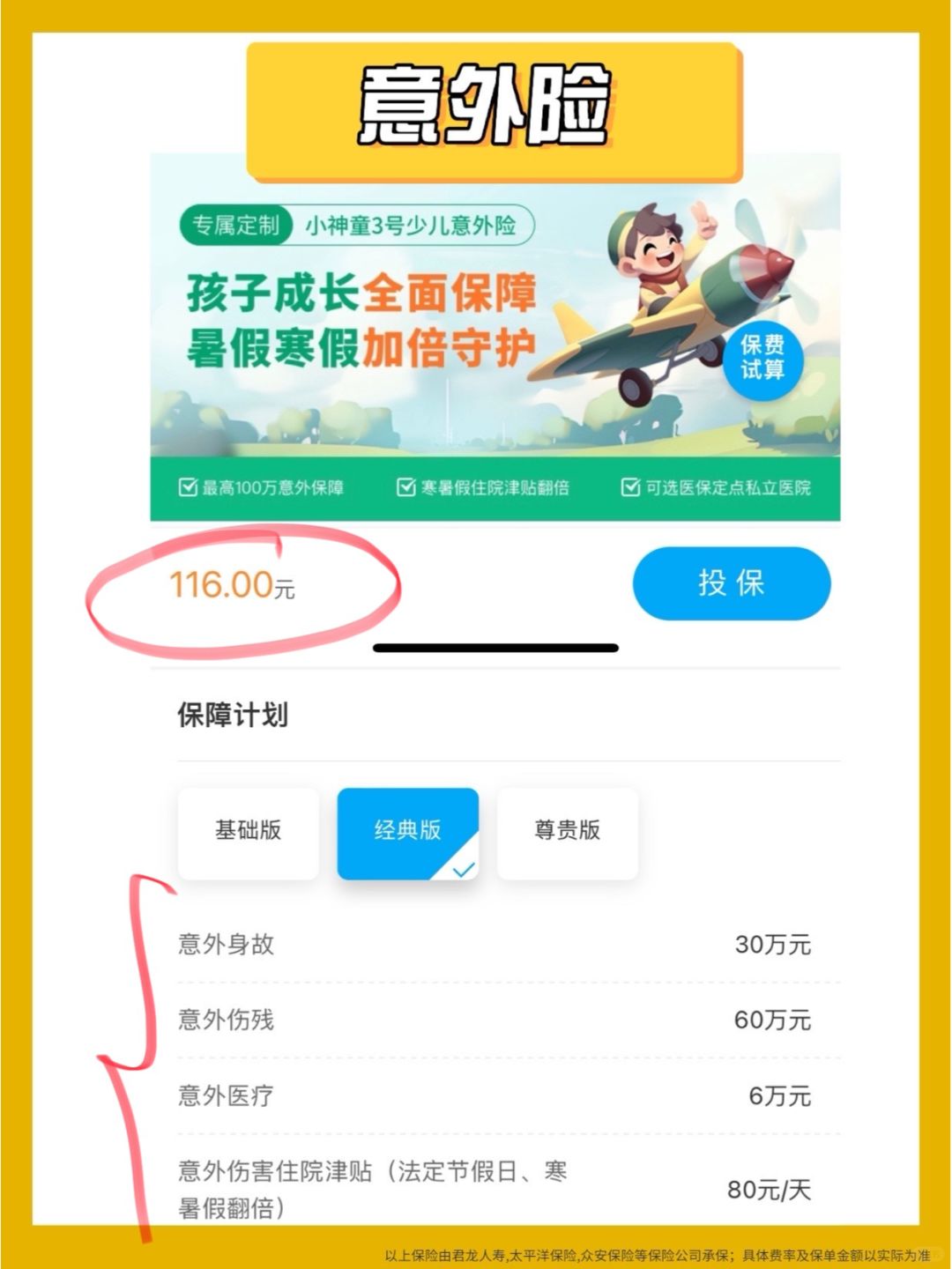 宝宝小,出意外的风险可能较高。一不留神,孩子烫伤、摔伤等意外都可以报销。记得优先考虑不限社保、免赔额低的