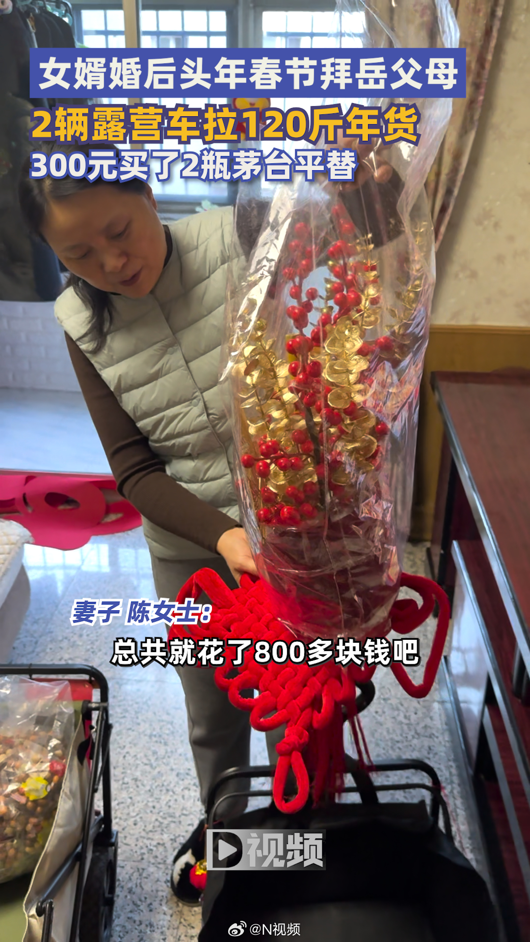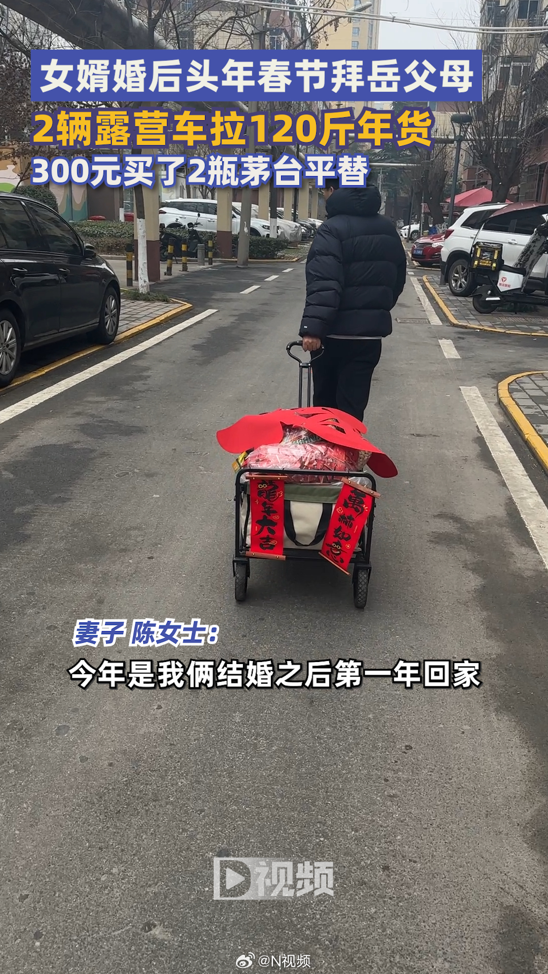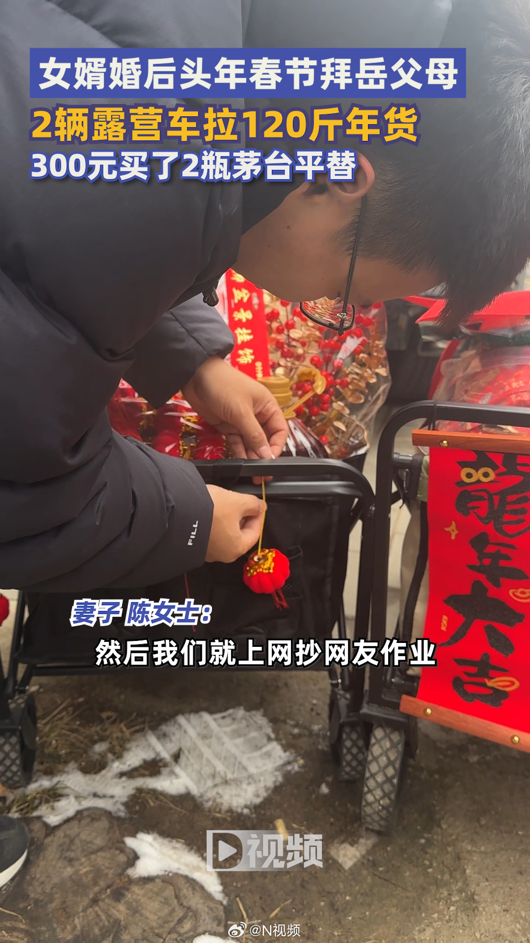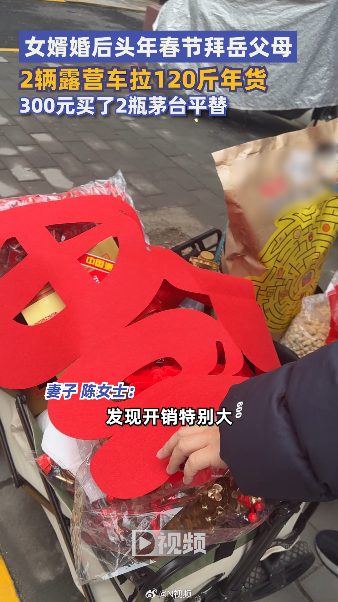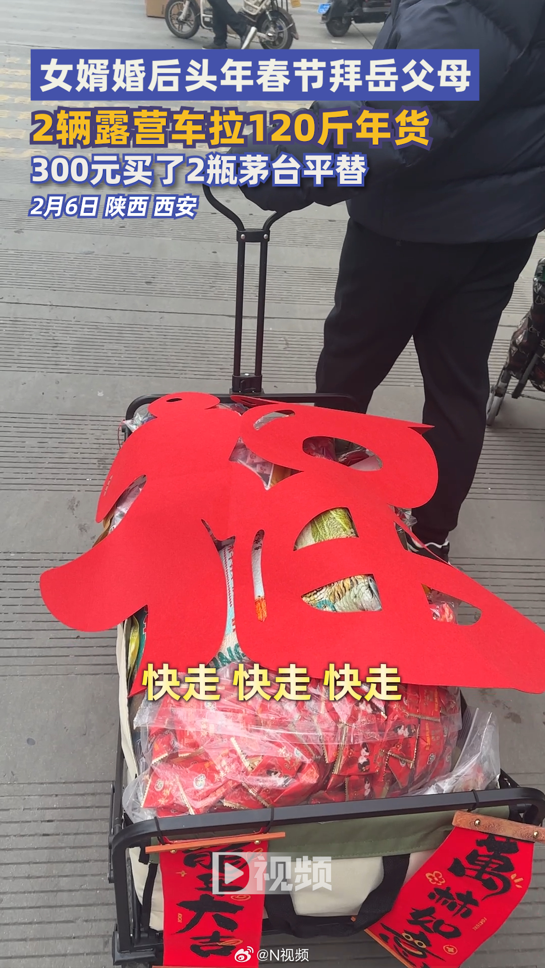 【#新女婿拜丈人送300元茅台平替#:120斤年货让岳父母看懵】2月6日,陕西西安。新年倒计时3天!年前这段日子,家家户户都会准备各类年货迎接春节的到来。路上一对夫妻拉了满满2辆露营车的年货吸引了大家的注意,在路上回头率拉满。据悉,这是陈女士新婚后第一次过年,便想着以这种方式给娘家送年货。陈女士表示,临近春节备年货环节十分发愁,于是在网上抄了网友作业,买了一些大家推荐的年货,还花费300元2瓶的酱香白酒当茅台平替,120斤的年货总共花了800元左右,性价比满满。#为什么年轻人爱上平替年货#