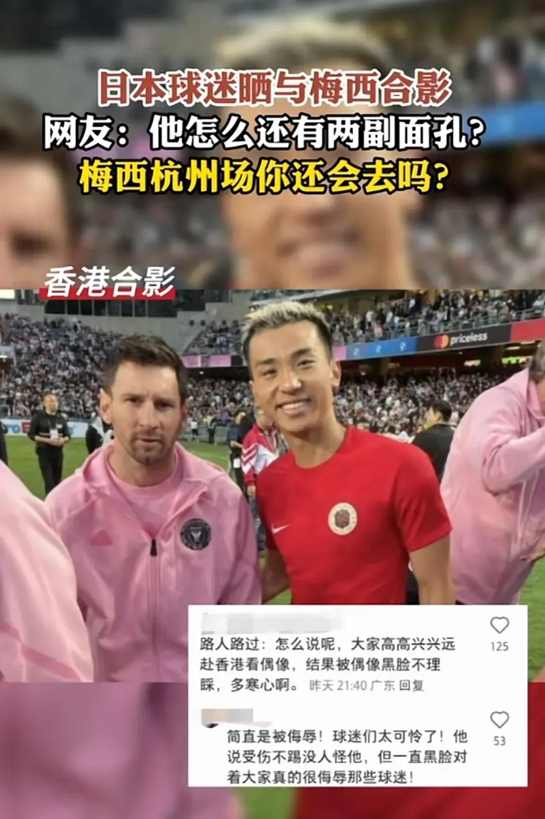 梅西和日本第一牛郎罗兰合影,和日本球迷合影,在日本的比赛上场了,据说健步如飞,笑容满面,啥伤痛?伤痛只留给香港?这说明啥?只要不瞎不残,都知道。 有网友倡议大家抵制梅西杭州行,附议者众。 那个哭了,把存了三年的梅西海报和球衣扔掉的中国同学(图2),就是众多失望的中国球迷的缩影。喜欢他的人,这次被他伤透了心。 港真,梅西不值得。