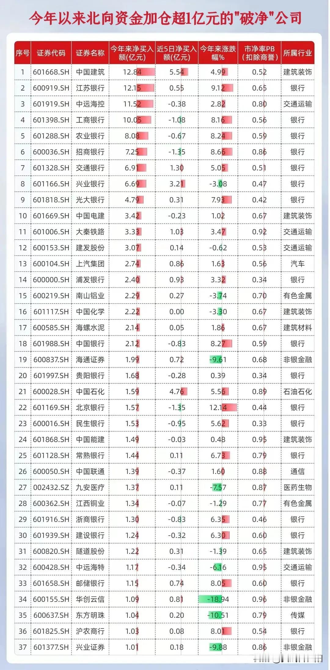 北向资金再次成功抄底。今年以来北向资金积极加仓市值超5亿元的公司和积极大幅加仓的跌破净资产的公司名册。北向资金被称为聪明的资金,确实有值得我们学习研究的地方。 以下整理的北向资金加仓情况,大家可以去研究下。觉得不错的也可以跟其他朋友一起分享。