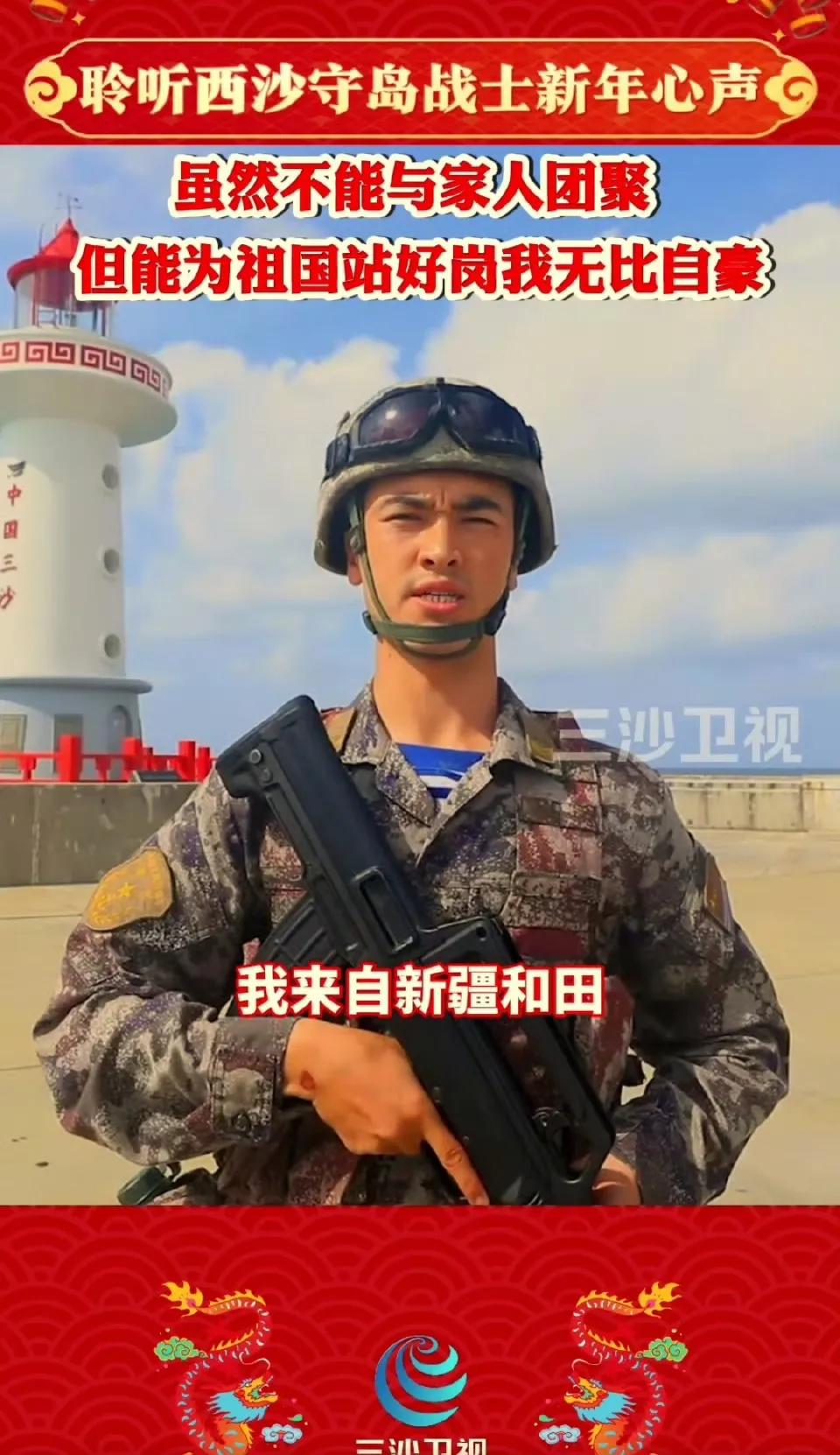 驻守在雅鲁藏布江畔的边防官兵在战位向全国人民拜年,与此同时驻守在西沙群岛的新疆小伙也向全国人民拜了年。 对此我想说,我作为人民群众的一员也向所有坚守在站位上的人民子弟兵们拜年,向所有军人家属以及烈士家属拜年。祝你们在新的一年里万事如意。 最后我还想说,是你们长期以来的牺牲和奉献,才能让我们平平安安的过一个幸福年。我在这里谢谢你们了。