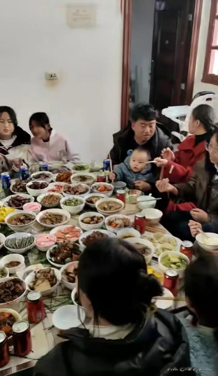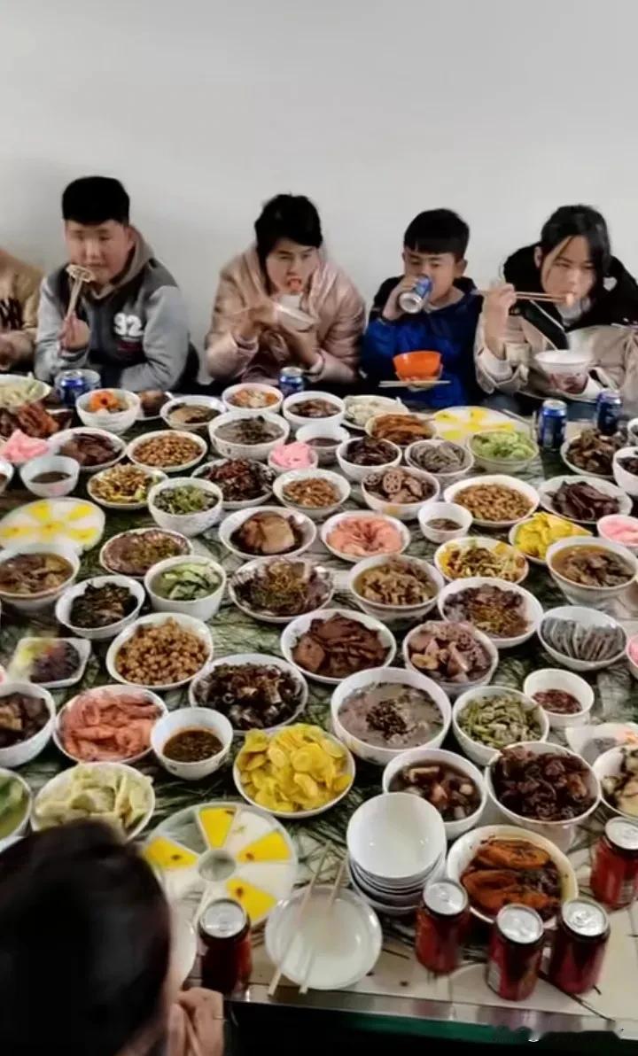 每个菜分了几份,分几桌的,拼成一大桌了。热闹。