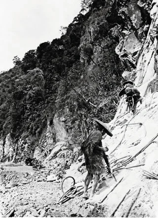 图3:穿着蓑衣的中国工人在用美军提供的现代工具修筑中印公路