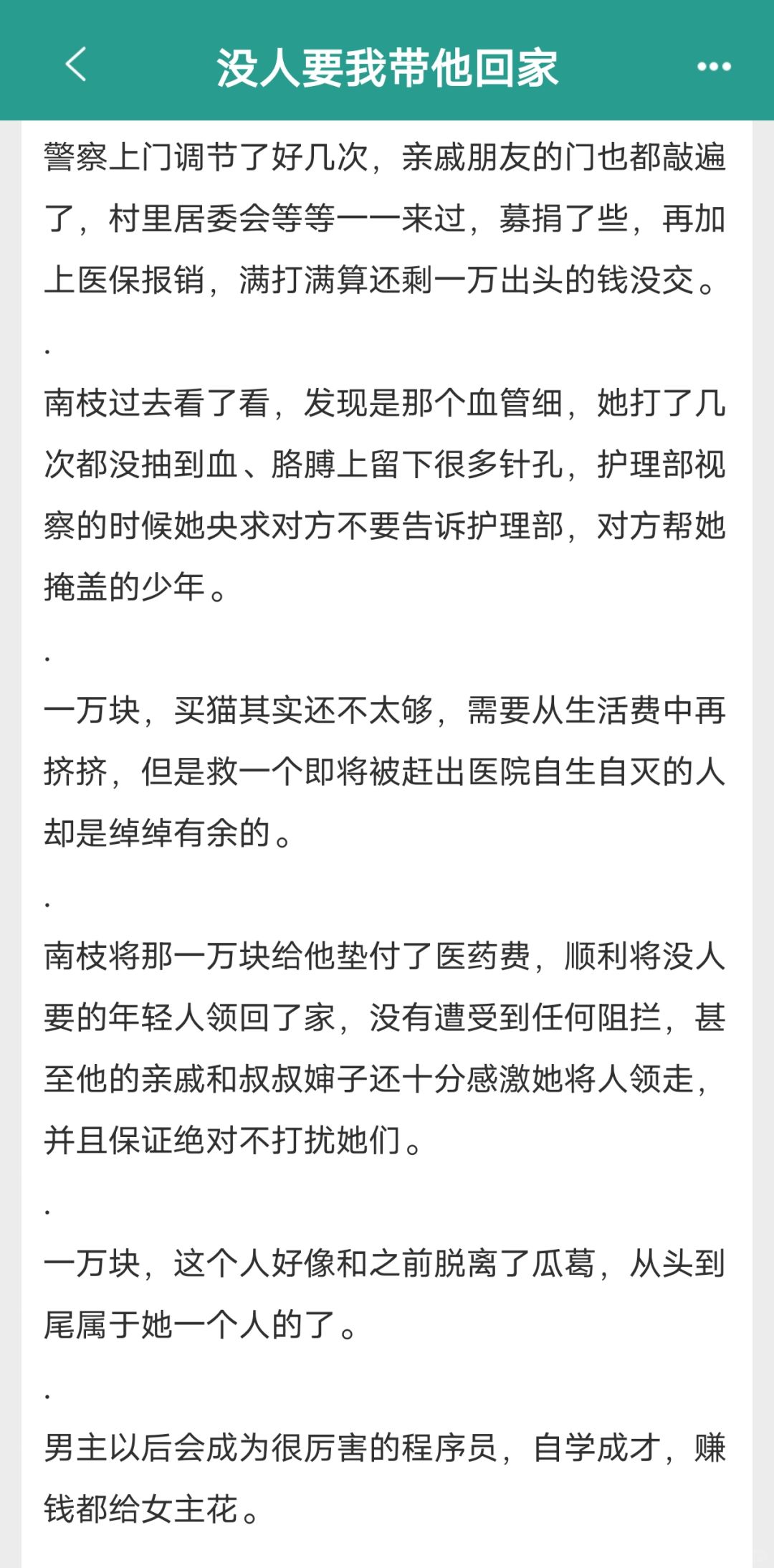 南枝将那一万块给他垫付了医药费,顺利将没人要的年轻人领回了家,没有遭受到任何阻拦,甚至他的亲戚和叔叔婶子还十分感激她将人领走,并且保证绝对不打扰她们。