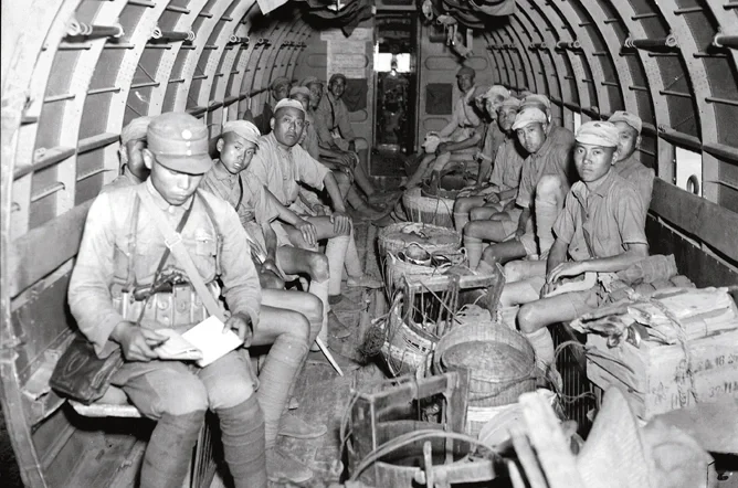 图2:1944年9月15日,云南驿机场,中国军队第5军第200师的士兵登上一架C-47型运输机,准备前往保山