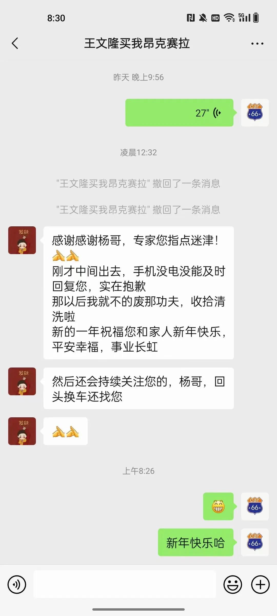 过年也是回复信息忙不停[呲牙] 做的生意虽然不大,但是每个朋友,尤其是信任我们的朋友,都会以诚相待。经常说的"唯信任不可辜负"不只是一句空话。 其实淘车生意结束以后,基本没什么交集了,客套话就不说了,因为生活圈子,地理位置毕竟有限,但是需要我们的时候,肯定尽力而为。
