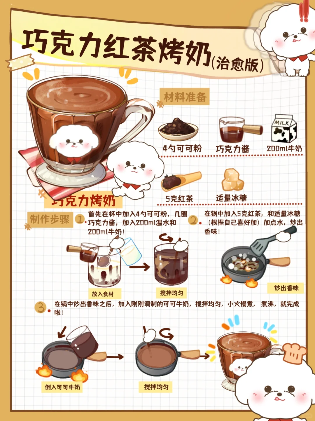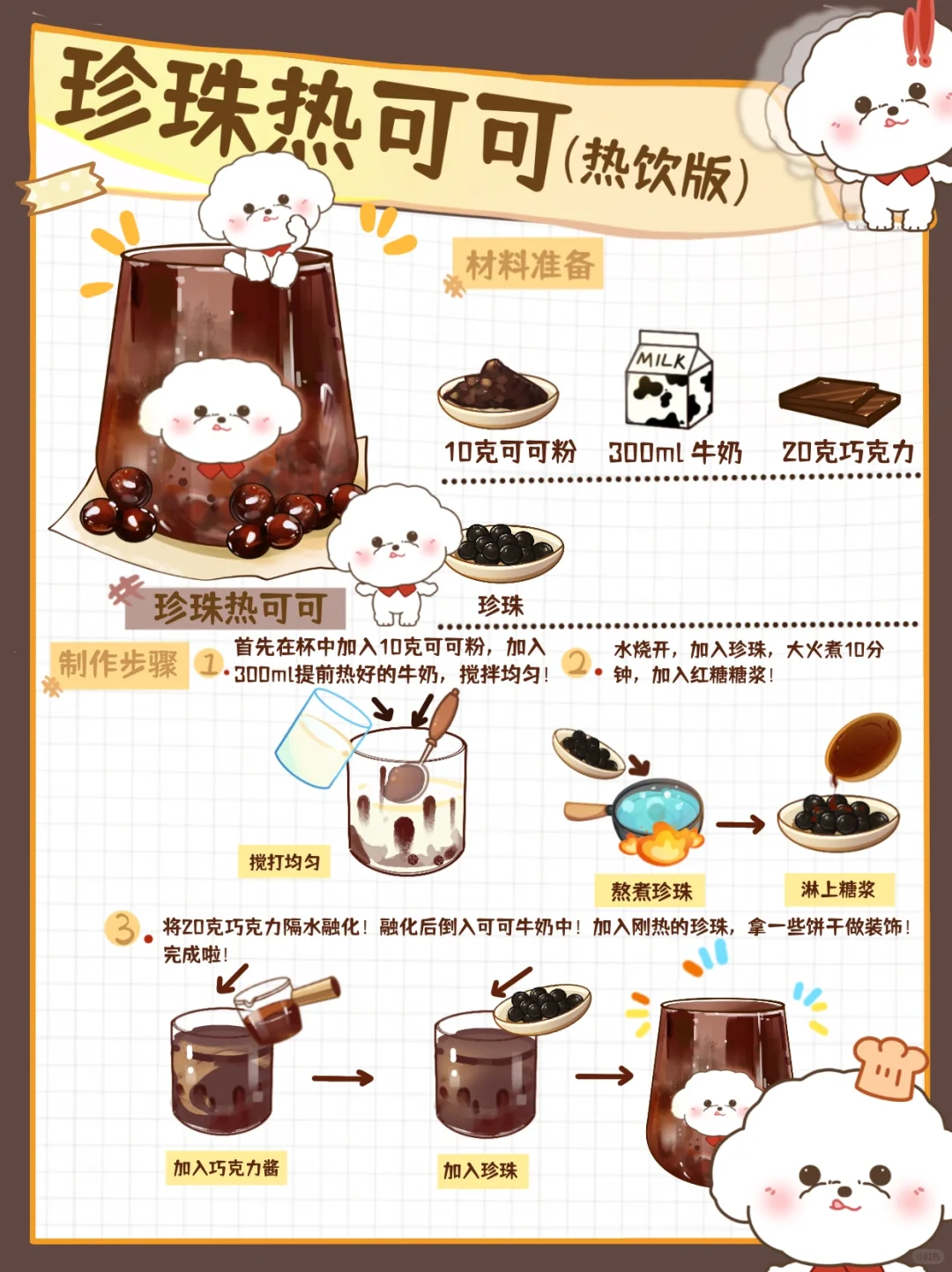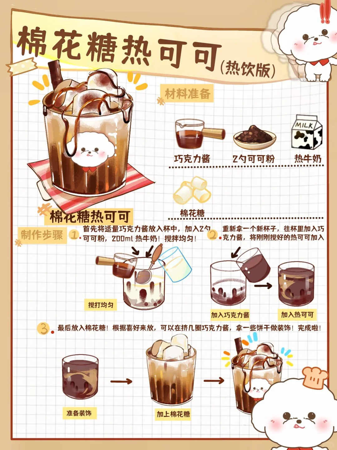 🌟巧克力控专属频道来啦🍫🍫 🍫巧克力红茶烤奶🥛 4勺可可粉 ➕几圈巧克力酱 ➕炼乳 ➕200毫升温水 ➕200毫升牛奶 🍫 棉花糖热可可🍬 巧克力酱➕2勺可可粉➕热牛奶🥛➕棉花糖 🍫生椰可可🍃🥥 2勺可可粉➕厚椰乳 ➕2圈巧克力酱➕冰块🧊 🍫 珍珠热可可🥤 10克可可粉➕300ml牛奶➕20克巧克力➕珍珠
