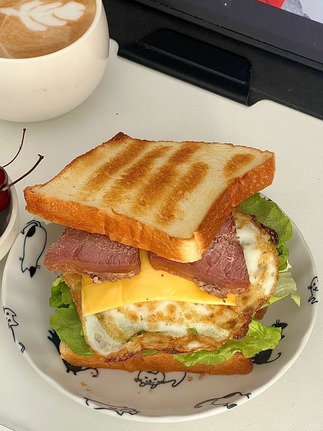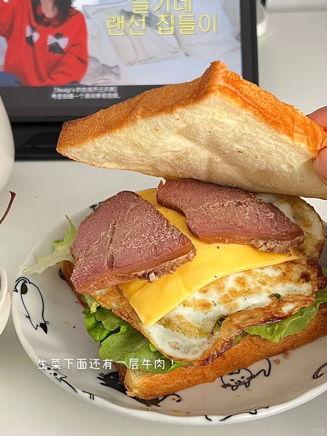 食材:吐司片、卤牛肉、煎蛋、芝士片、低卡蛋黄酱、生菜。