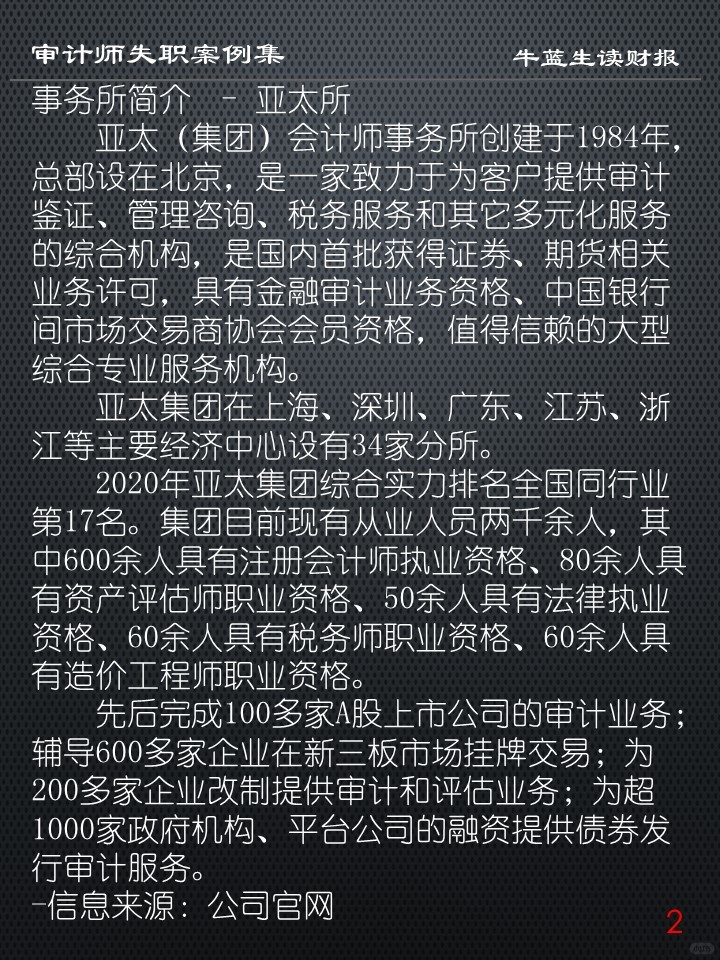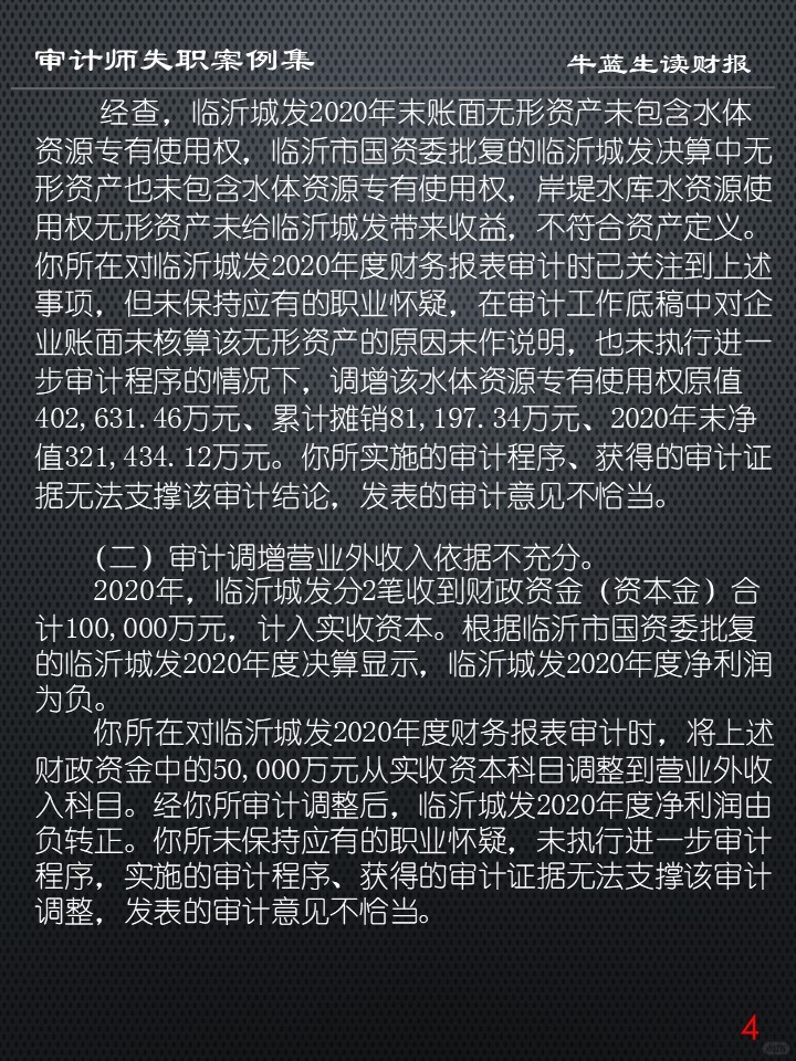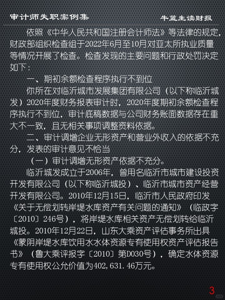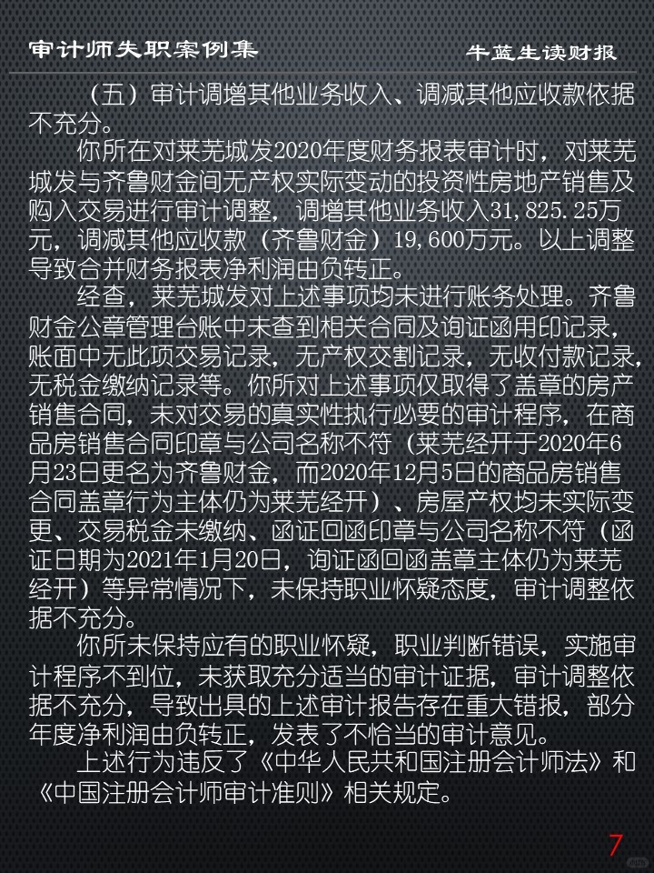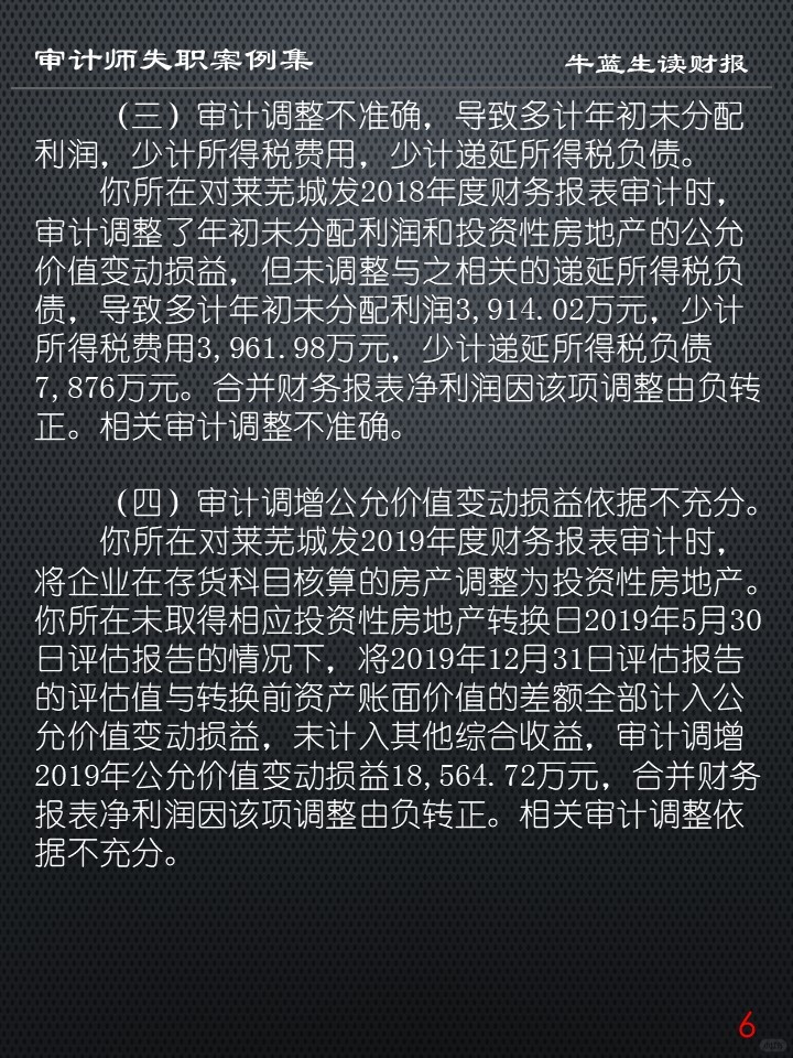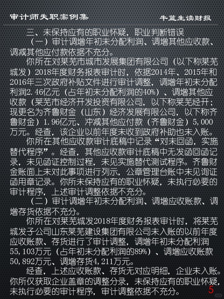※财政部处罚决定书:财监法〔2023〕116号 ✈亚太所未保持应有的职业怀疑,职业判断错误,实施审计程序不到位,未获取充分适当的审计证据,审计调整依据不充分,导致出具的审计报告(临沂城发2020年度财务报表审计,莱芜城发2018-2020年度财务报表审计)存在重大错报,部分年度净利润由负转正,发表了不恰当的审计意见。