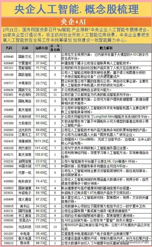 文生视频Sora的一阵阵春风,把AI吹向了全世界每一个角落。AI在全世界都逐渐沸腾了起来,连我国央企国企都要主动拥抱AI人工智能。 央国企AI布局情况和(央企+AI)概念详解!这央国企AI或许会成为新主线。