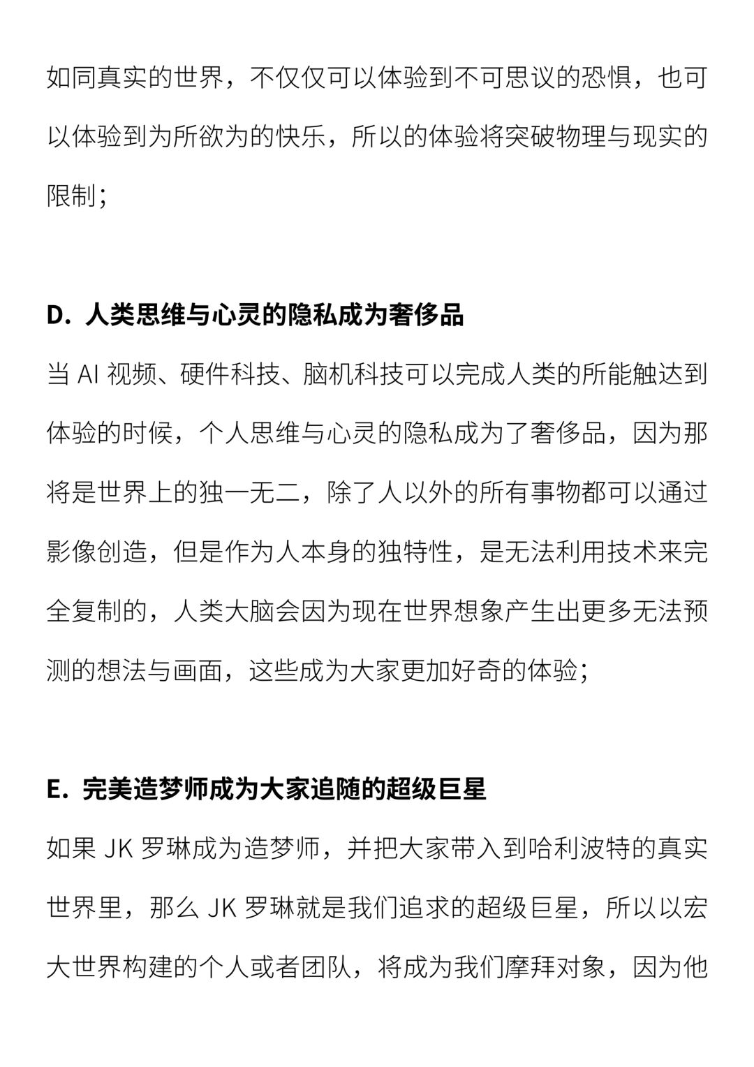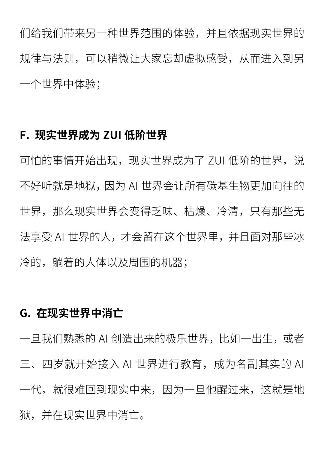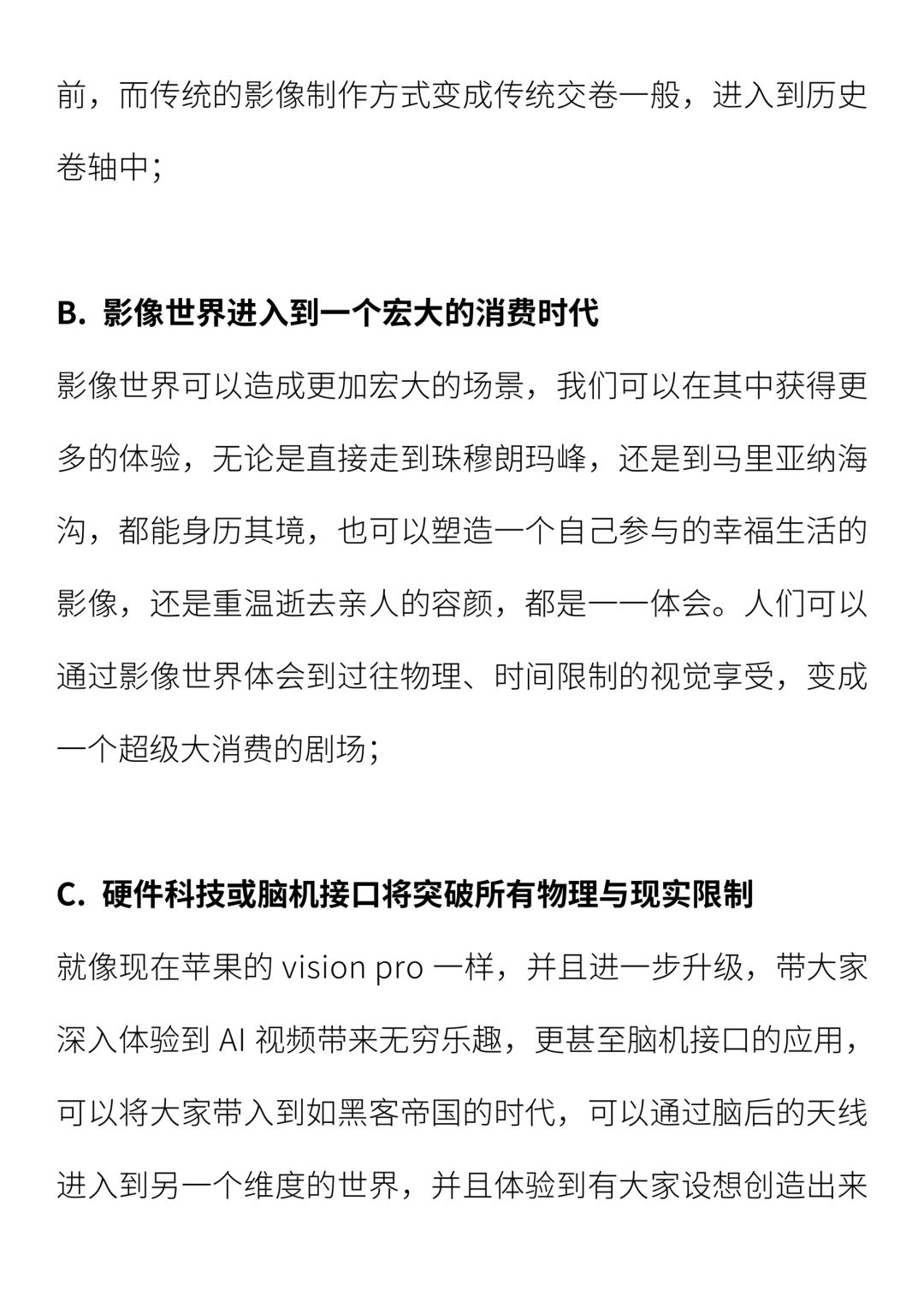 求职 找工作 Sora AI gpt4 gpt 📄之前GPT出来的时候,就有这么一个设想。 A.AI视频将代替影像世界 B.影像世界进入到一个宏大的消费时代 C.硬件科技或脑机接口将突破所有物理与现实限制 D.人类思维与心灵的隐私成为奢侈品 E.完美造梦师成为大家追随的超级巨星 F.现实世界成为ZUI低阶世界 G.在现实世界中消亡