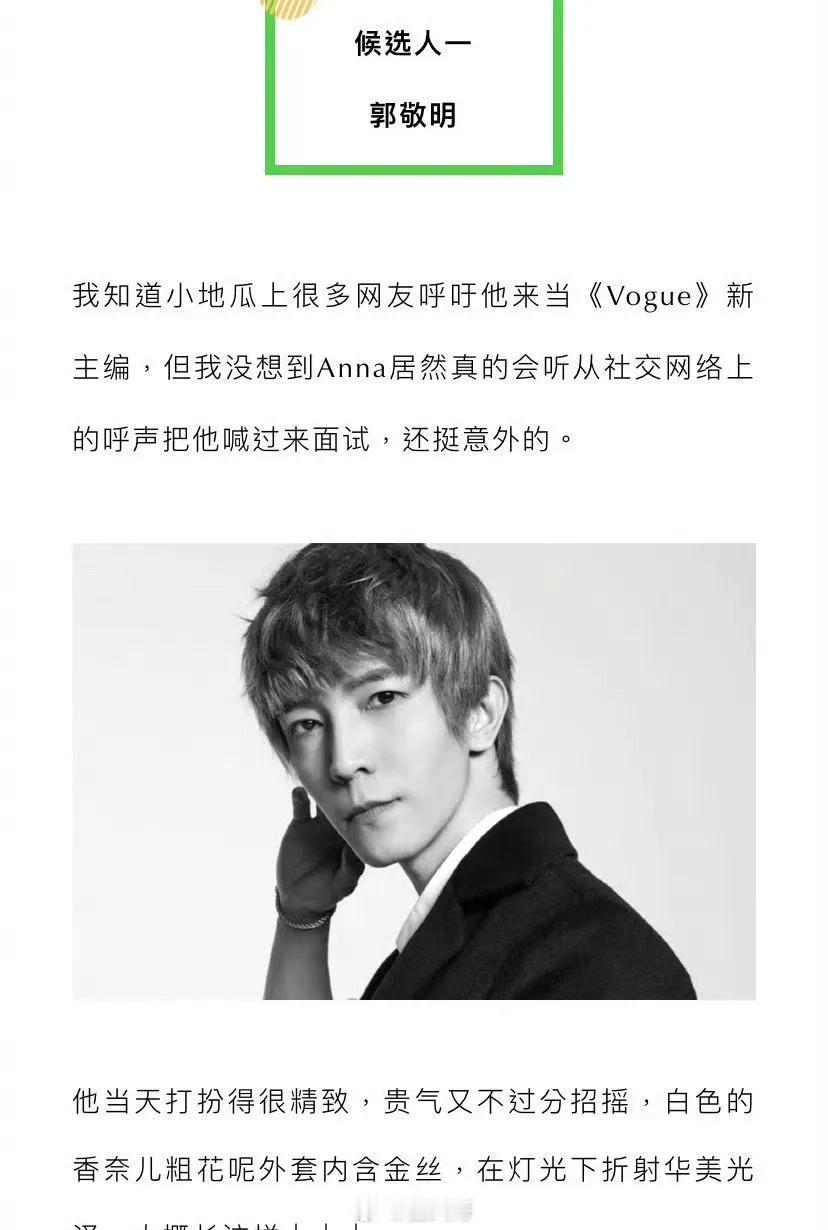 宇博gogoboi说他去面试Vogue副主编,竞争者是郭敬明、章小蕙、晚晚…… 按我的印象,我觉得章小蕙是最适合的…,毕竟人家一直吃这碗饭,自己买买买,带人买买买;郭敬明嘛…勉强吧,看他拍的戏,不提剧情,审美还行;gogoboi是知名时尚博主,但我不了解,有近千万微博粉丝;晚晚…就…是来凑数的吧[what] gogoboi说得煞有介事的…… 但,最后,他说这事是他编的[笑哭]…… 嗐…,还编得挺真的[笑哭][黑线]