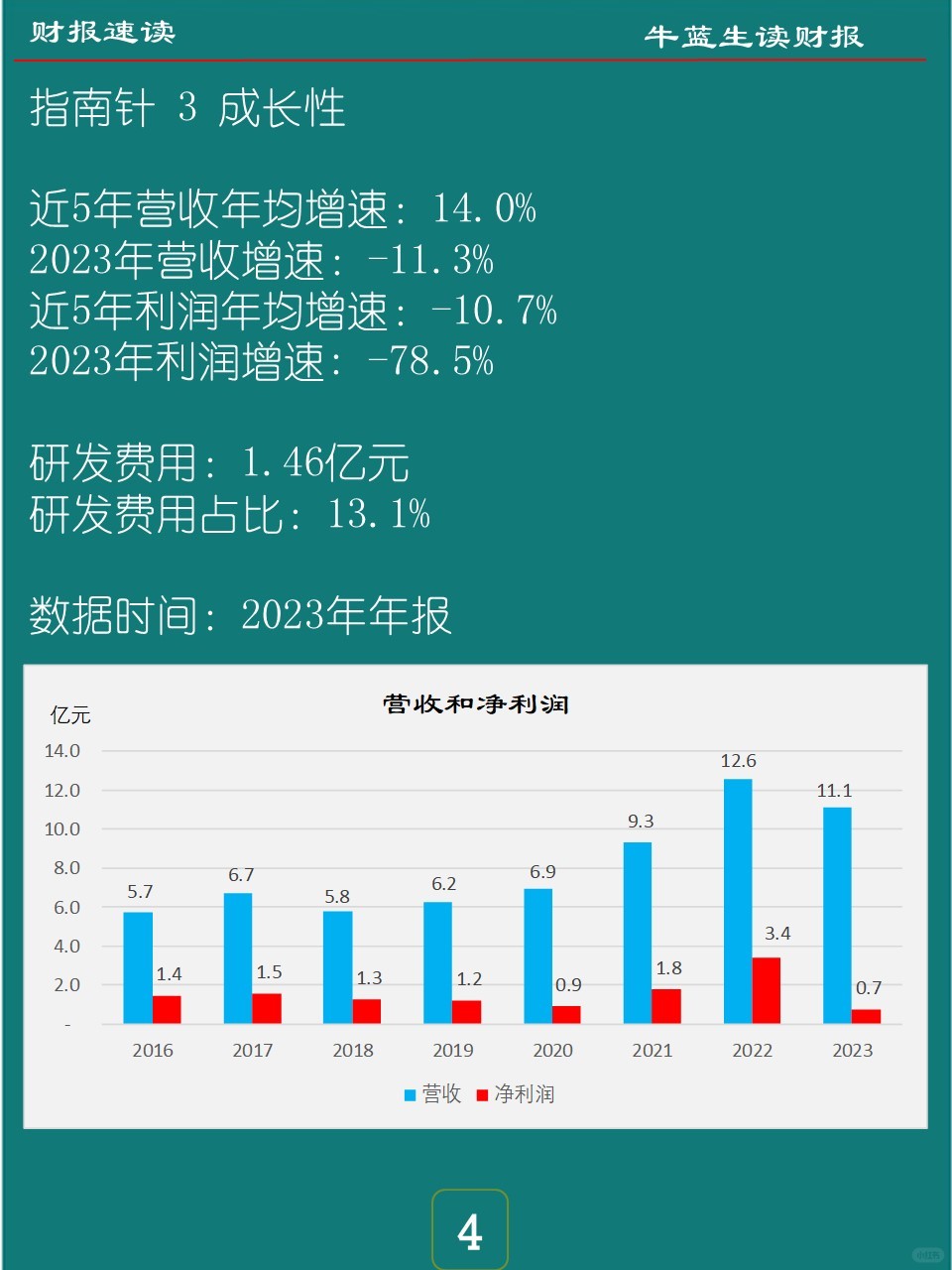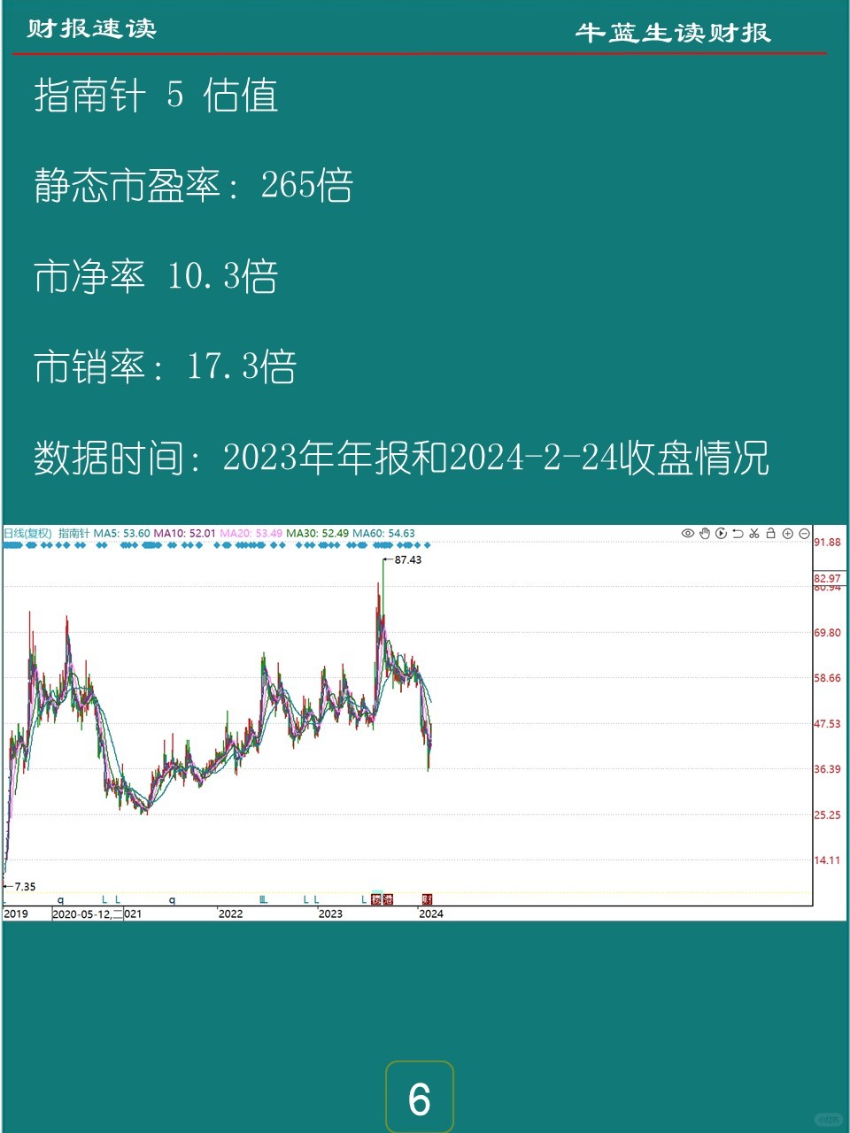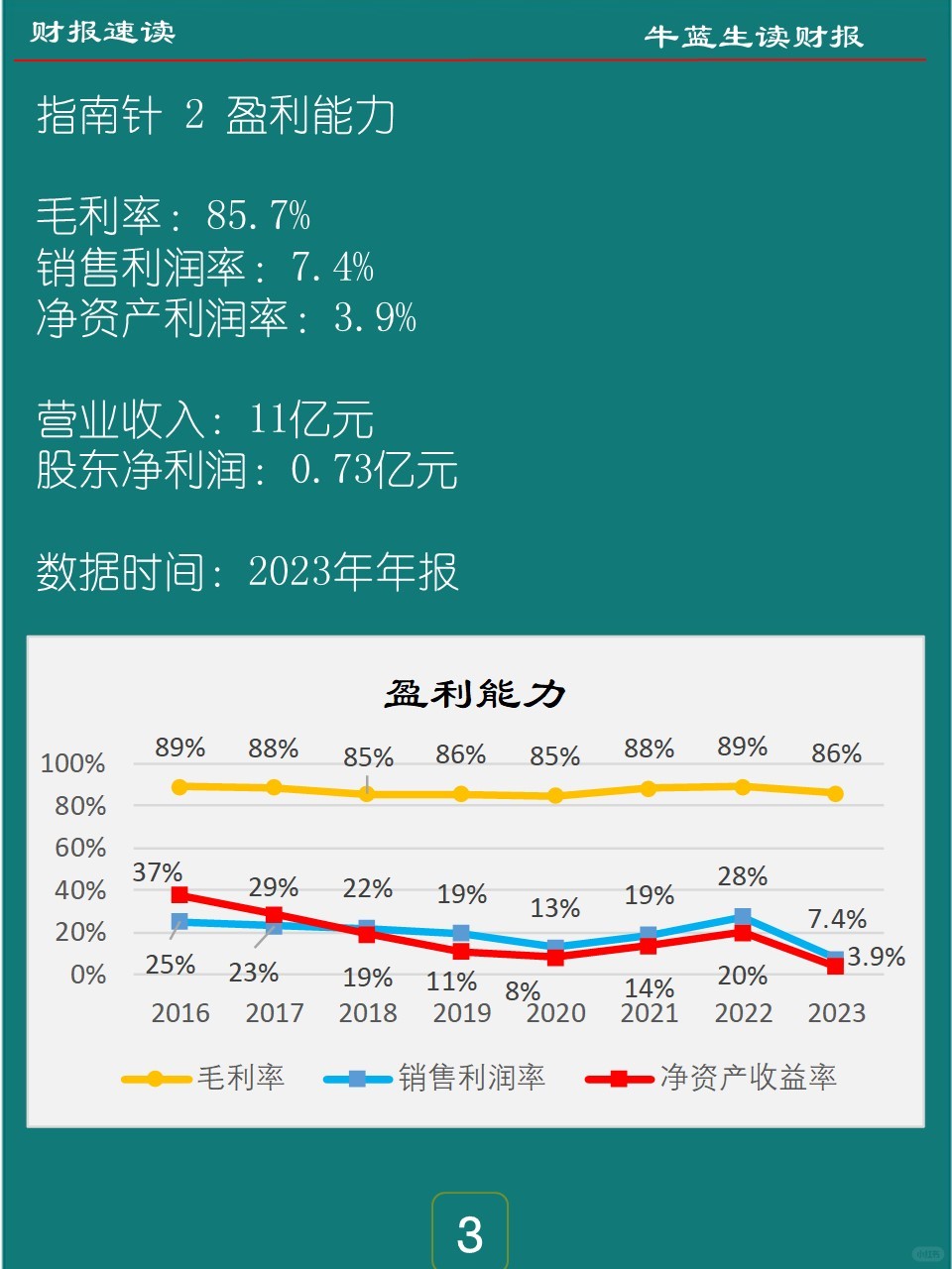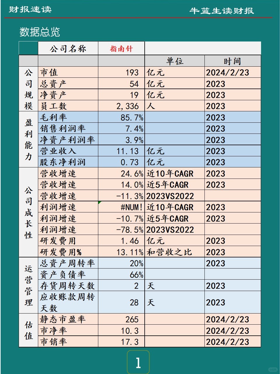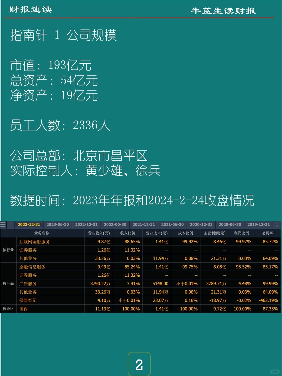 北京指南针科技发展股份有限公司主要业务是以证券工具型软件终端为载体,以互联网为工具,向tou资者提供及时、专业的jin融数据分析和证券tou资咨询服务;互联网证券业务。公司主要产品和服务是jin融信息服务、证券业务、广告服务。 主营业务构成分析 -按产品,jin融信息服务85.2%,证券服务11.3%,广告服务3.4% -按地区,境内100%。 公司概况 -民企,员工2336人。总部在北京市。 -2023年营业收入11亿元,归母净利润0.73亿元。