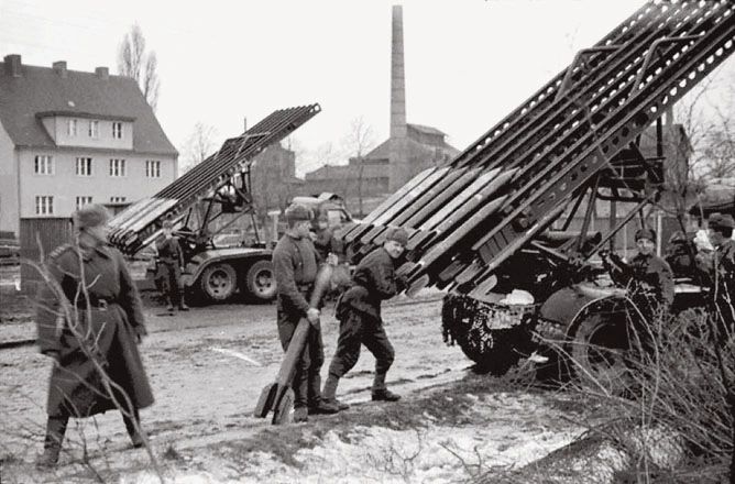 图2:1945年4月,柏林战役中,苏联红军战士正在加载“喀秋莎”火箭炮向德军阵地猛烈开火,在柏林,苏军部署了3255门“喀秋莎”火箭炮,给德国以致命的打击