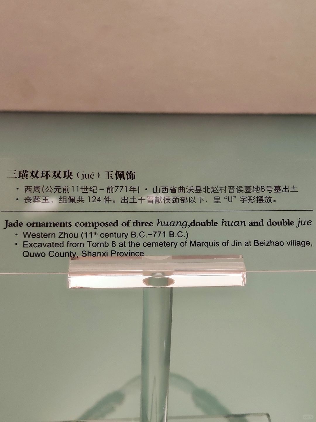 三璜双环双块(jue)玉佩饰 .西周(公元前11世纪﹣前771年),山西省曲沃县北赵村晋侯墓地8号墓出土.丧葬玉、组佩共124件。出土于晋献侯颈部以下,呈"U"字形摆放。现藏山西博物院 。