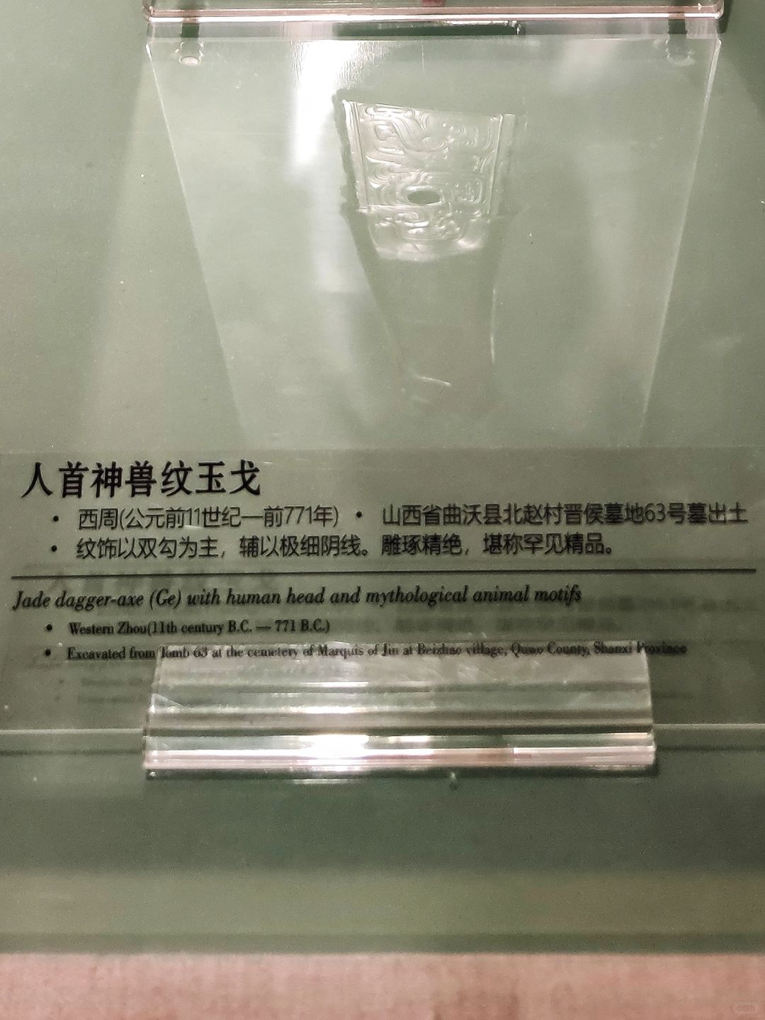 人首神兽纹玉戈. 西周(公元前11世纪一前771年)· 山西省曲沃县北赵村晋侯墓地63号墓出土。现藏山西博物院 . 纹饰以双勾为主,辅以极细阴线。雕琢精绝,堪称罕见精品。 Jade dagger-axe (Ge) with human head and mythological animal motifs · Western Zhou(11th century B.C.- 771 B.C.)