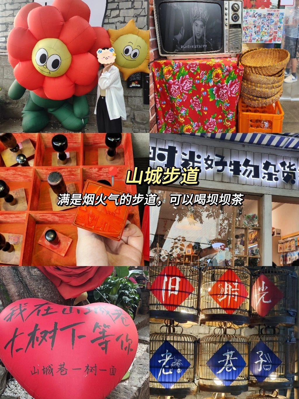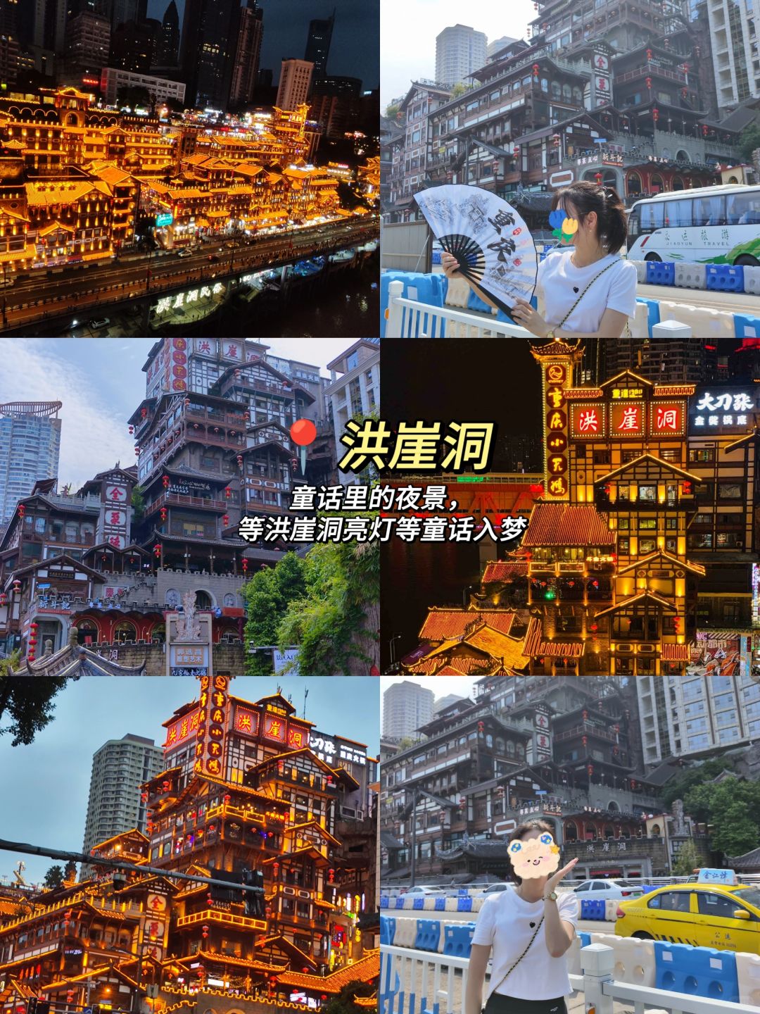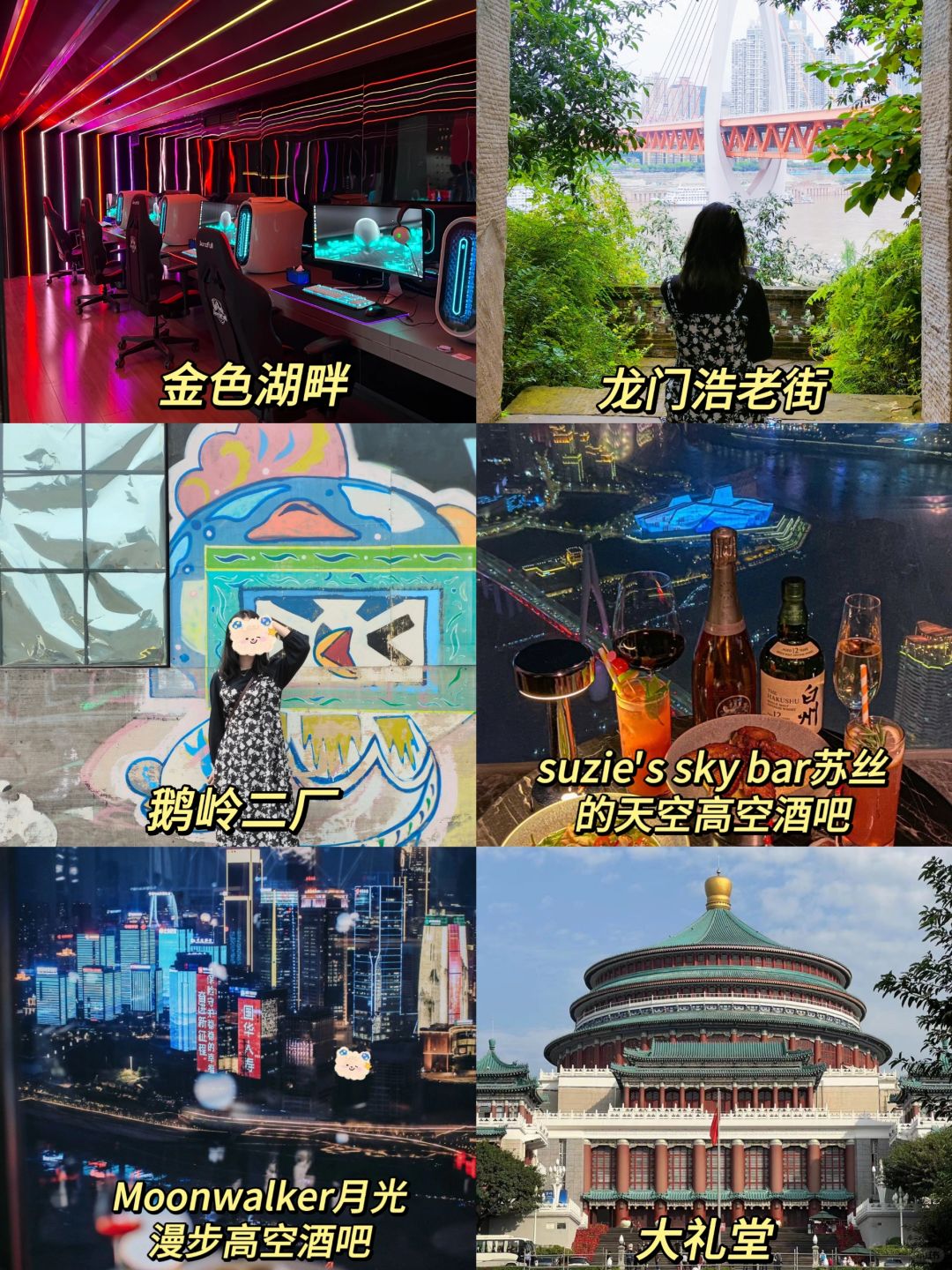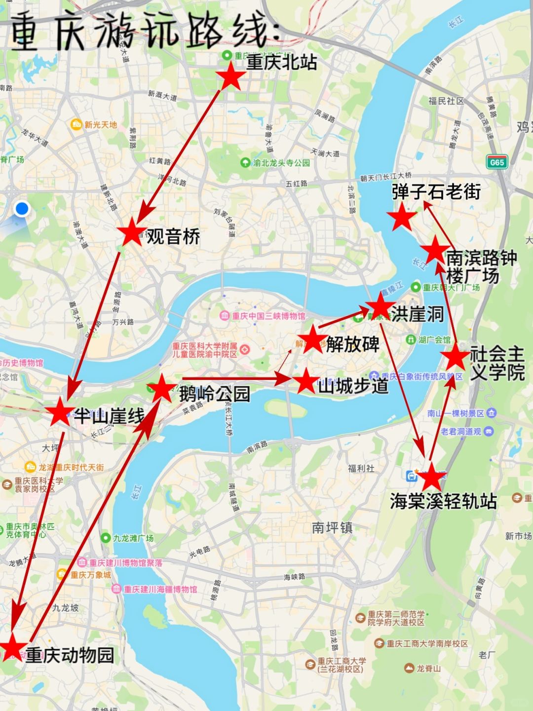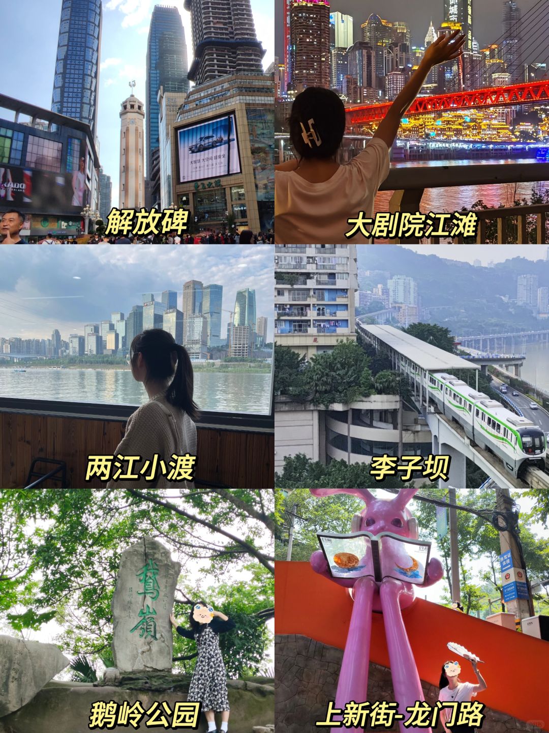 打卡景点:观音桥、半山崖线、重庆动物园、鹅岭公园、山城步道、解放碑、洪崖洞、海棠溪轻轨站、社会主义学院、南滨路钟楼广场、弹子石老街