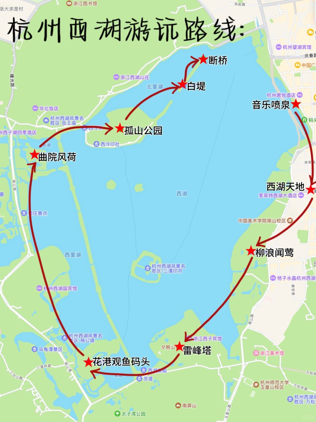 西湖游玩顺序:音乐喷泉⛲→西湖天地→柳浪闻莺→雷峰塔→花港观鱼码头→曲院风荷→孤山公园→白堤→断桥