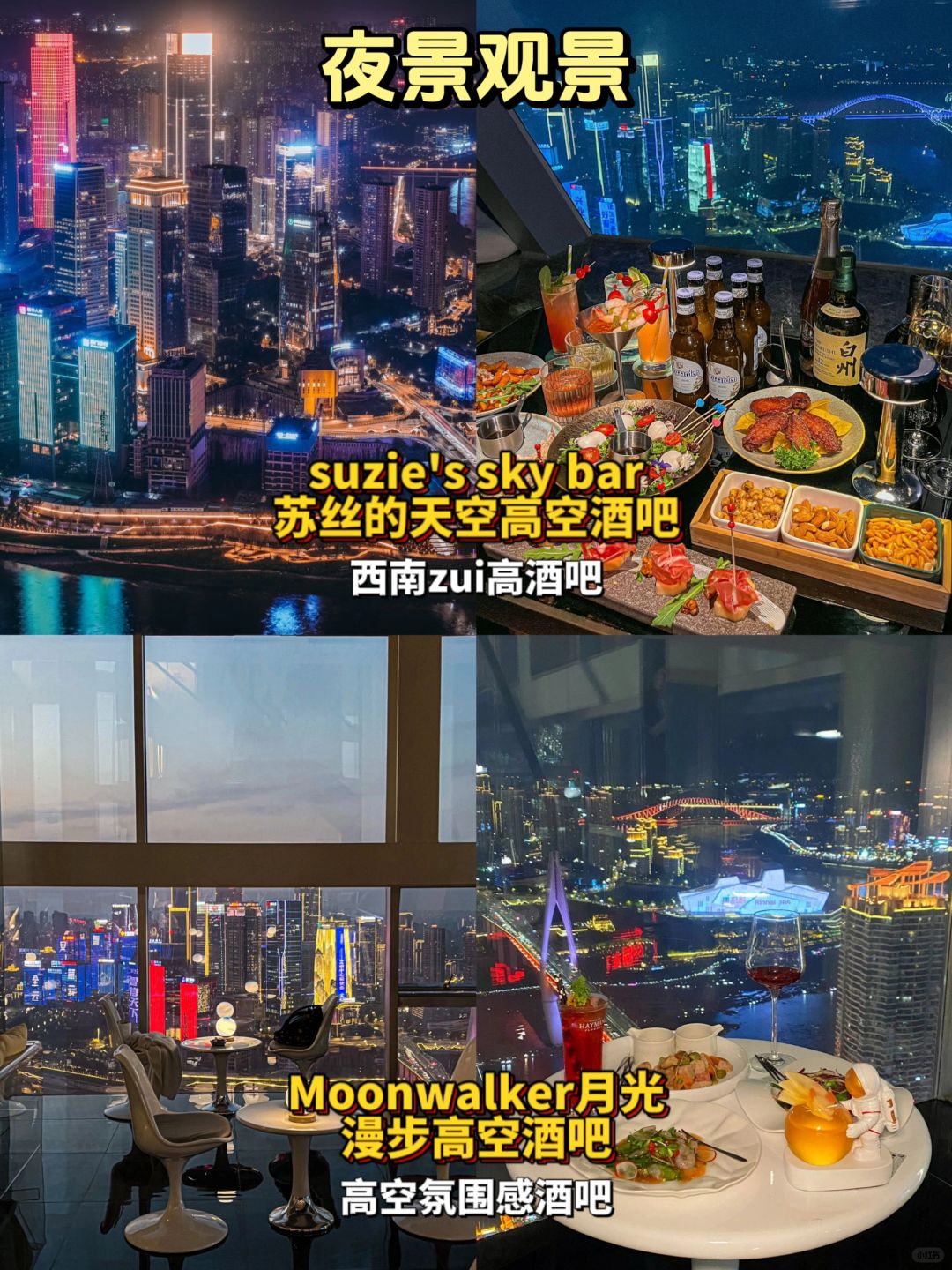 看完夜景可以去suzie's sky bar苏丝的天空高空酒吧、Moonwalker月光漫步高空酒吧体验重庆的夜生活。