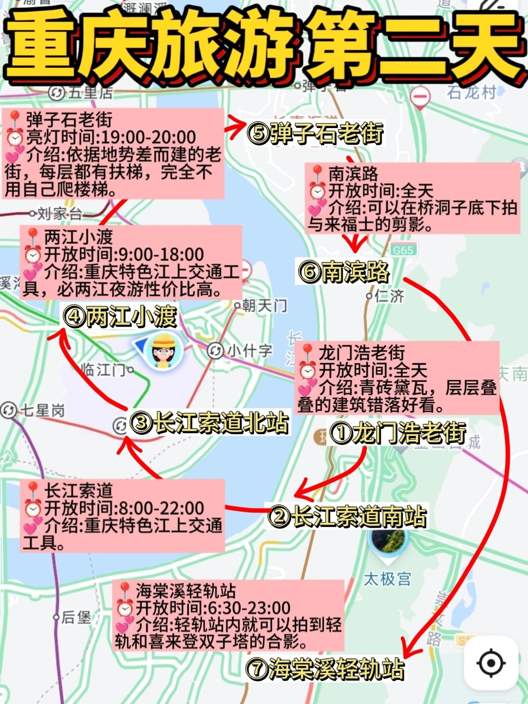 第二天:龙门浩老街-长江索道-两江小渡-弹子石老街-南滨路-海棠溪轻轨站