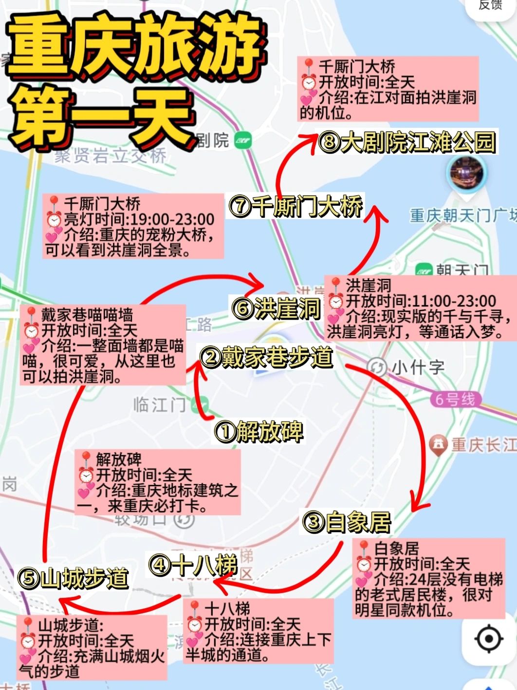 第一天:解放碑-戴家巷步道-白象居-十八梯-山城步道-洪崖洞-千厮门大桥-大剧院江滩公园