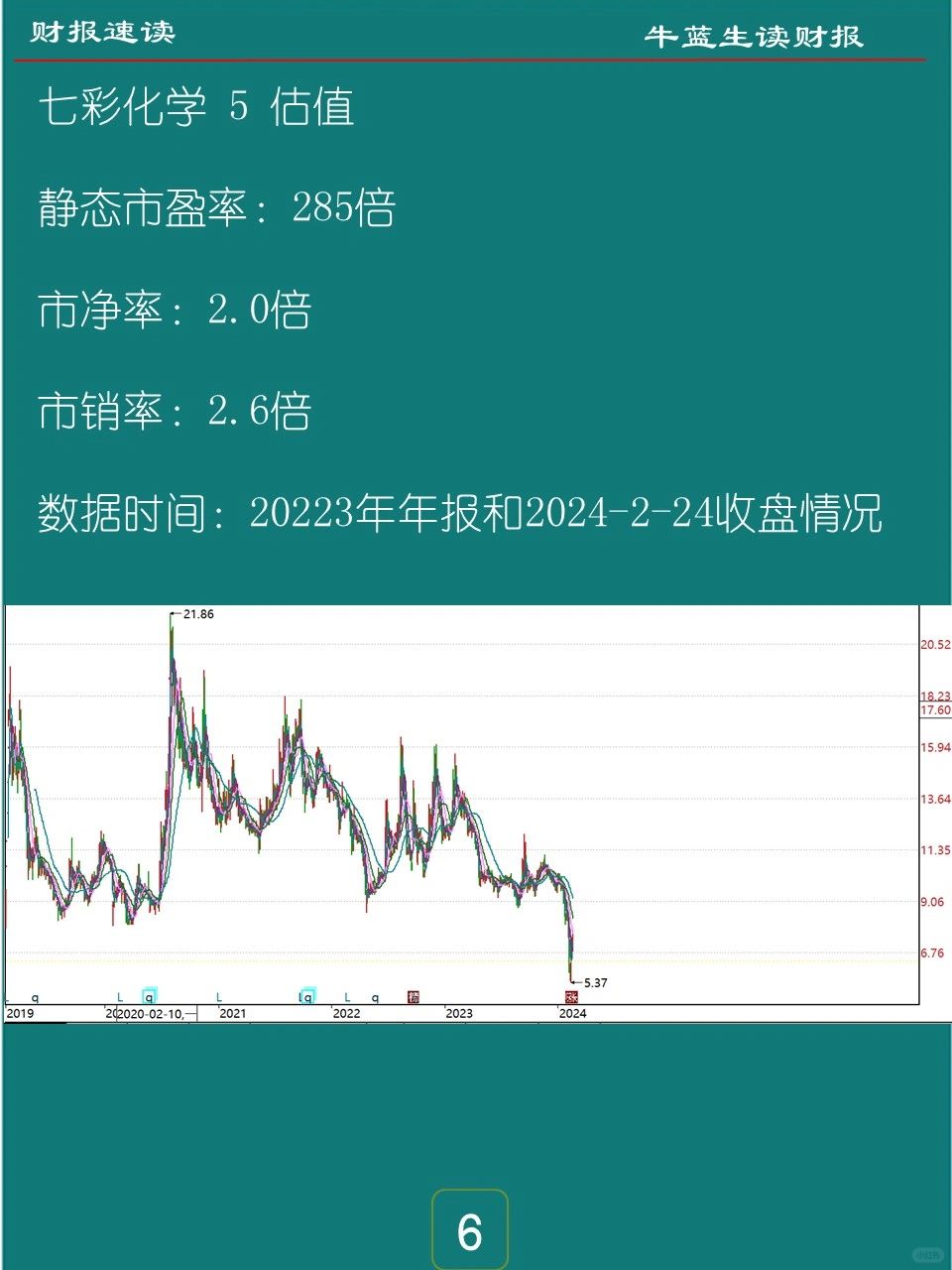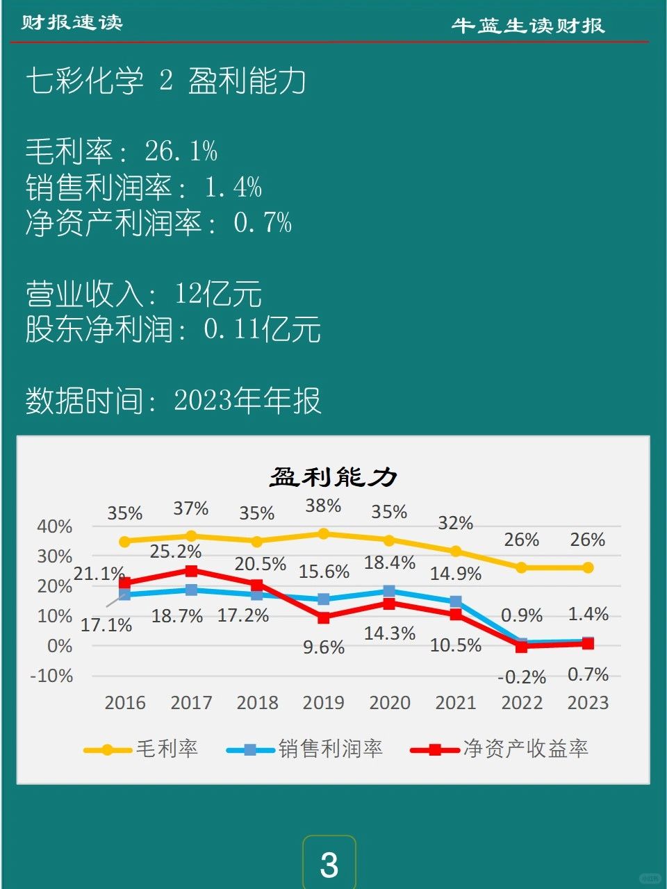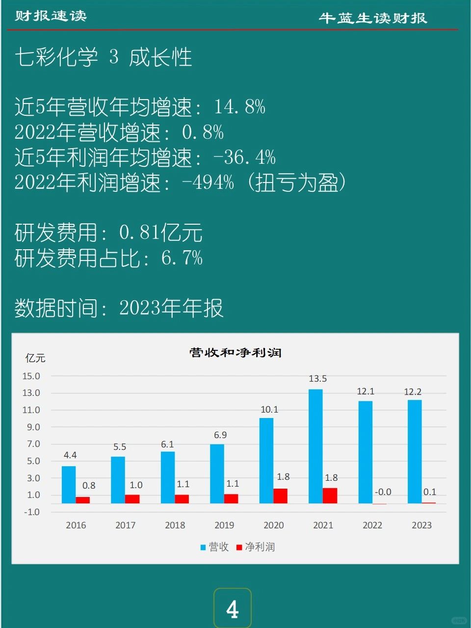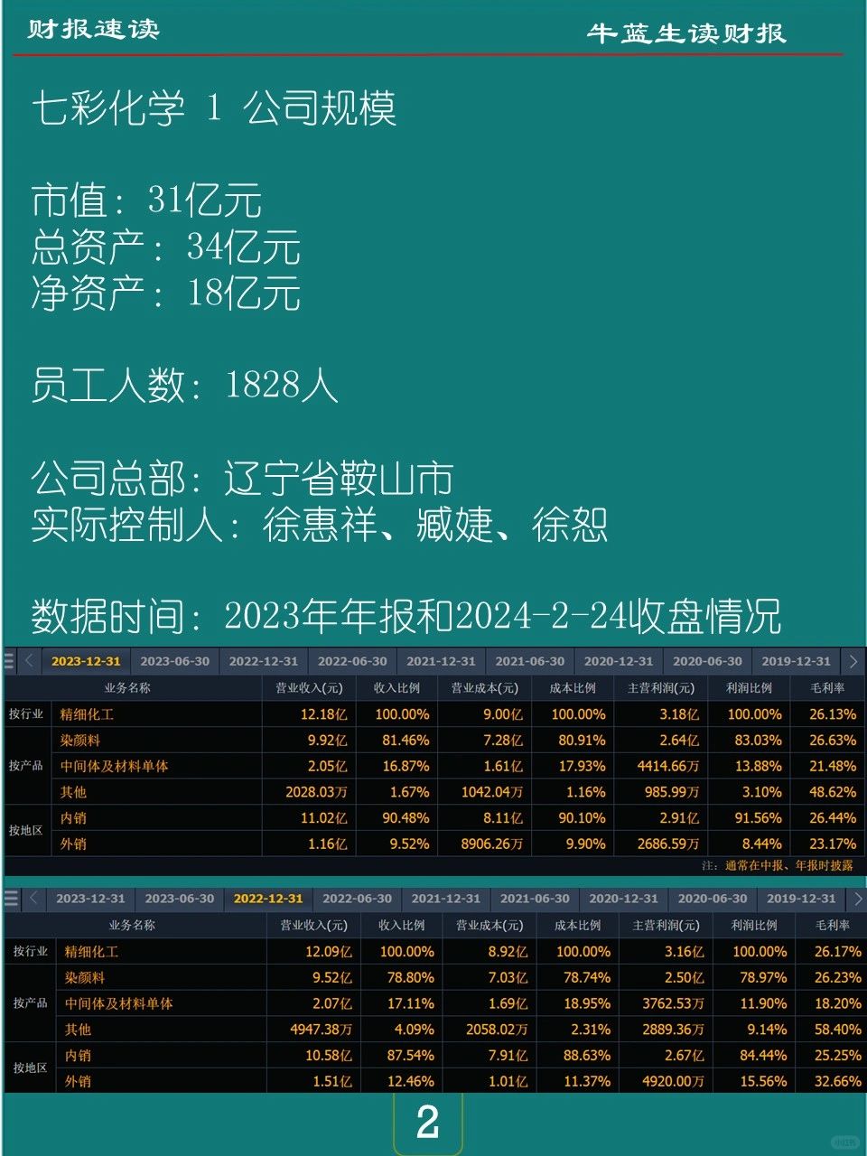 鞍山七彩化学股份有限公司主要从事高性能有机颜料、染料的研发、生产与销售。主要产品包括苯并咪唑酮系列高性能有机颜料、大分子系列高性能有机颜料、偶氮染料、溶剂染料、异吲哚啉颜料以及相关染、颜料中间体。公司是国内最早将苯并咪唑酮系列产品产业化的企业之一。 主营业务构成分析 -按产品,染颜料81.5%,中间体及材料单体16.9%。 -按地区,内销90.5%,外销9.5%。 公司概况 -民企,员工1828人。总部在辽宁省鞍山市。 -2023年营业收入12亿元,归母净利润0.11亿元。