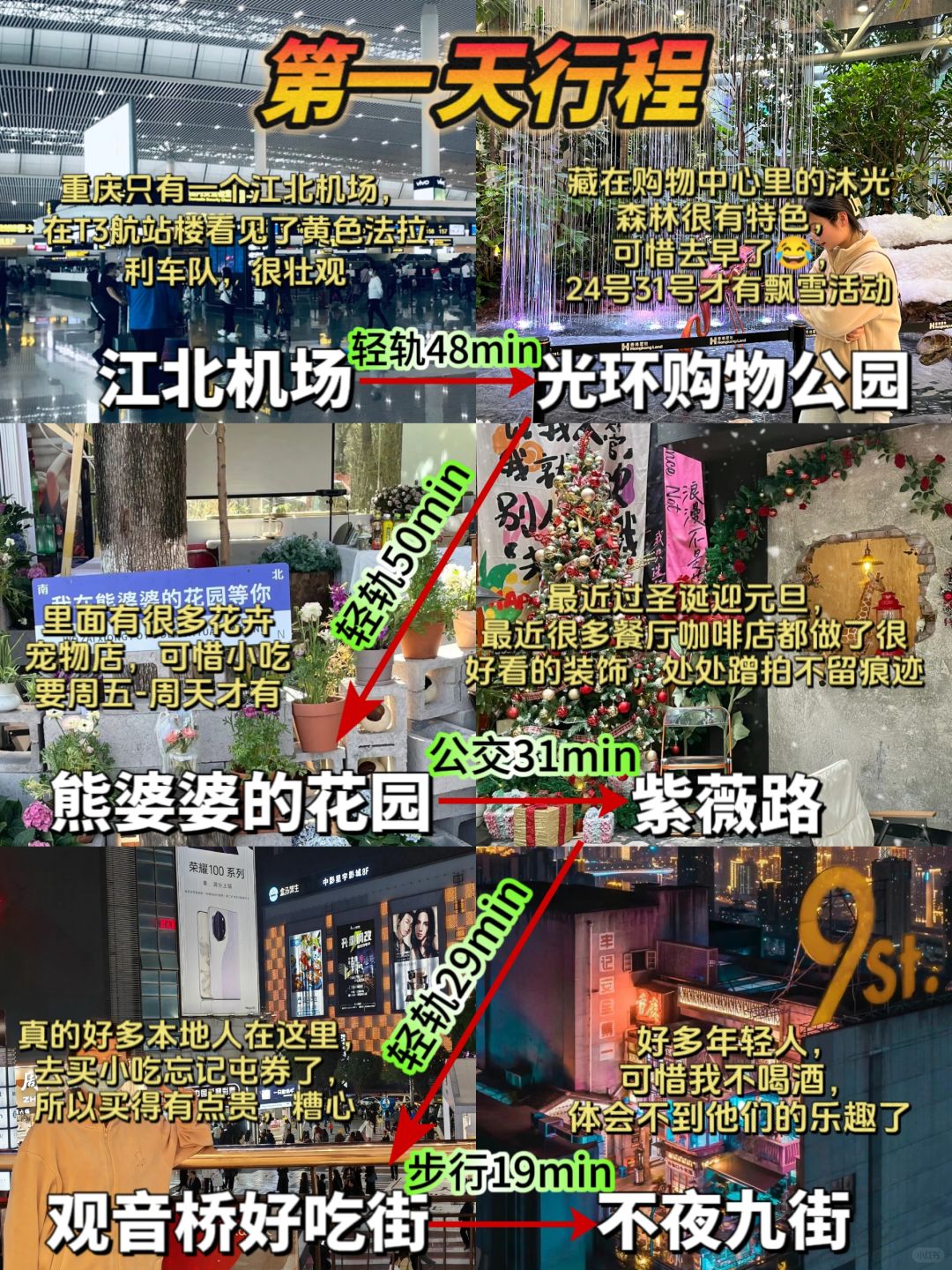 🏃DAY1:江北机场→光环购物公园→熊婆婆的花园→紫薇路→观音桥好吃街→不夜九街