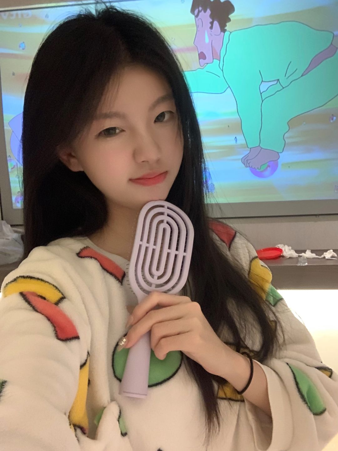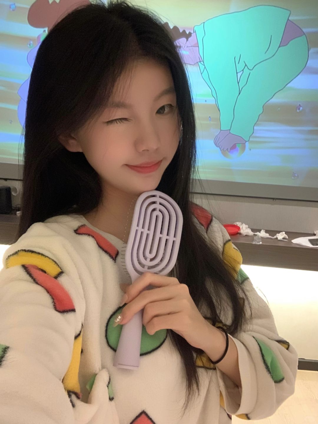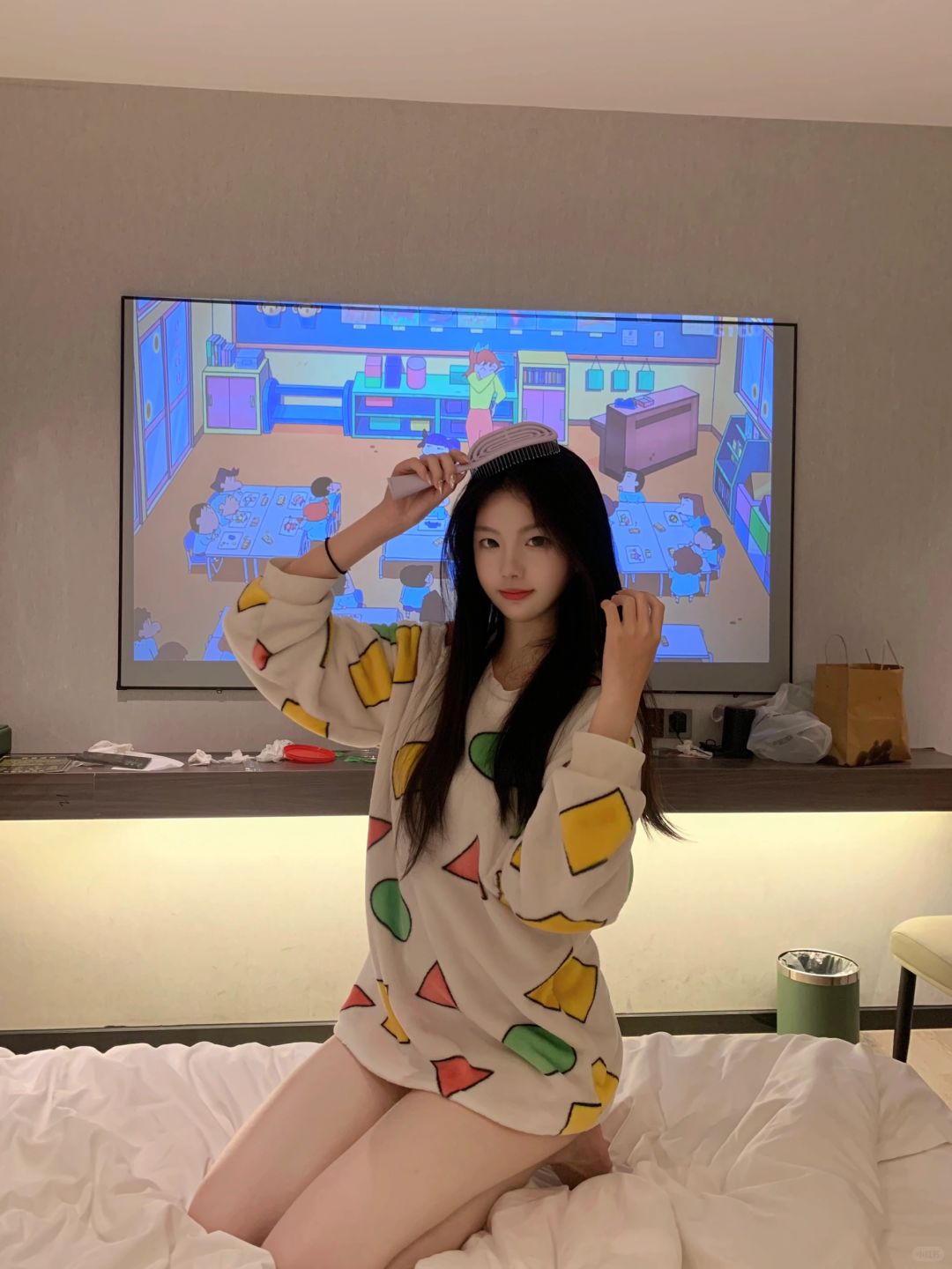 家开投影仪拍照当背景太出片啦~睡前穿小新睡衣和小新一起拍照📷 头发梳蓬松更有氛围感噢 新买的骨梳好好用