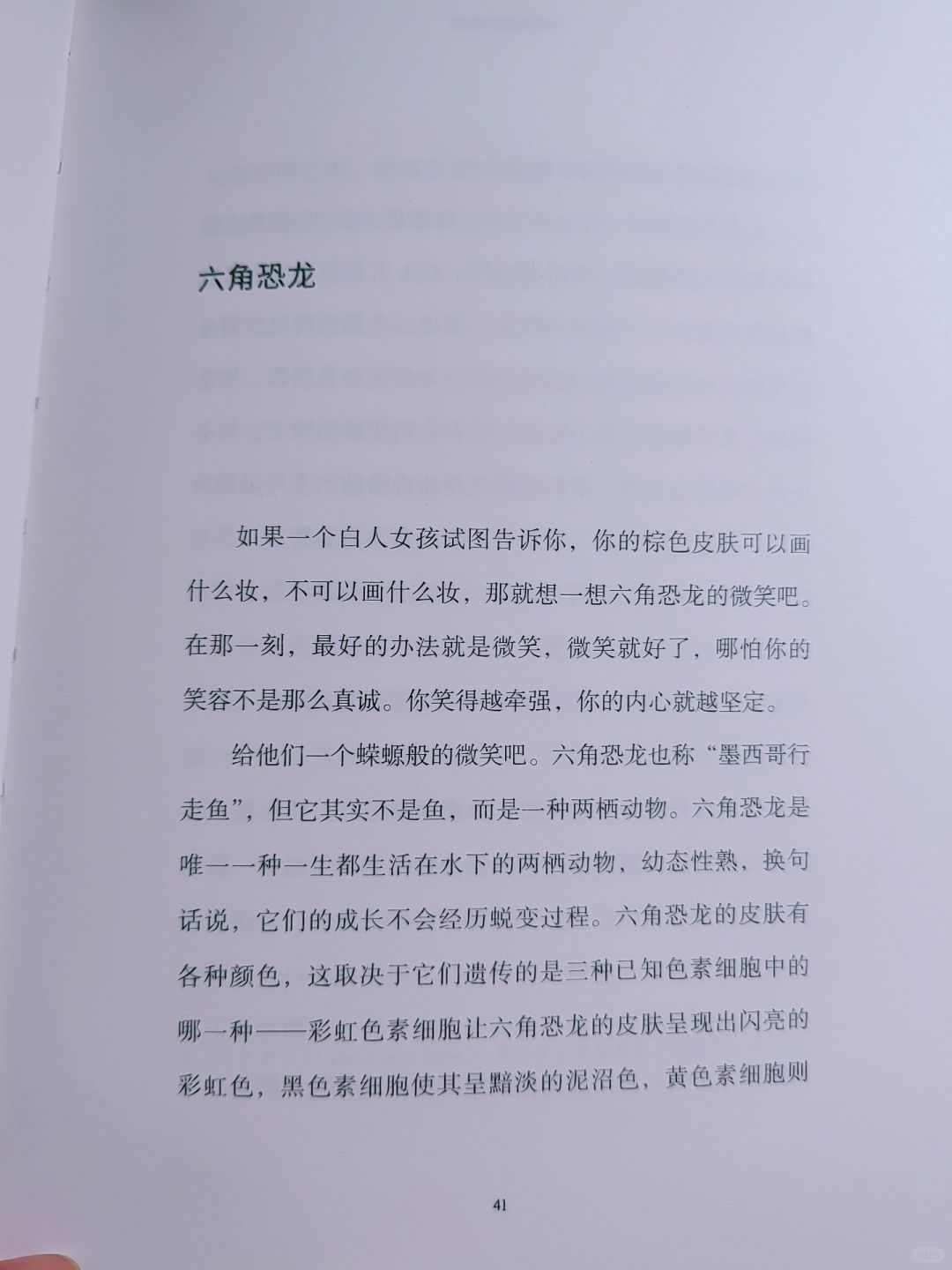 《六角恐龙的微笑》,主角是一个棕色皮肤女孩,她在白人群体中生活。懵懂的幼年时期,每天回家途中的黄金树,心型叶子投下的阴影,给她以慰藉。敏感的高中时期,作者经常搬家。与昔日好友分离,适应新环境,对孩子来说,无疑是非常大的挑战。敏感的她像一只幽灵蛸一样把自己隐藏起来。