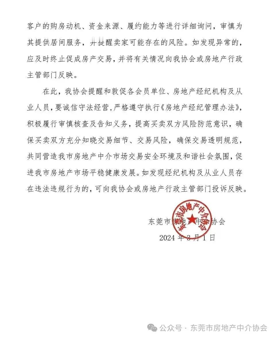 东莞中介发出交易提醒,谨防上当受骗。 存量房交易协商过程中,如买方提出采取分期付款方式支付房屋交易价款,且在支付首期房款后即先行办理过户,剩余房款在过户后约定时间内支付,卖方应充分意识到可能存在的风险,审慎进行交易。 去年东莞一中介德益恒老板炒房资金链断裂,涉及上亿元,用的也是此种手段。 东莞中介此时提醒,也是在二手房价跌到谷底,有炒房客会进场的形势下做得提醒。
