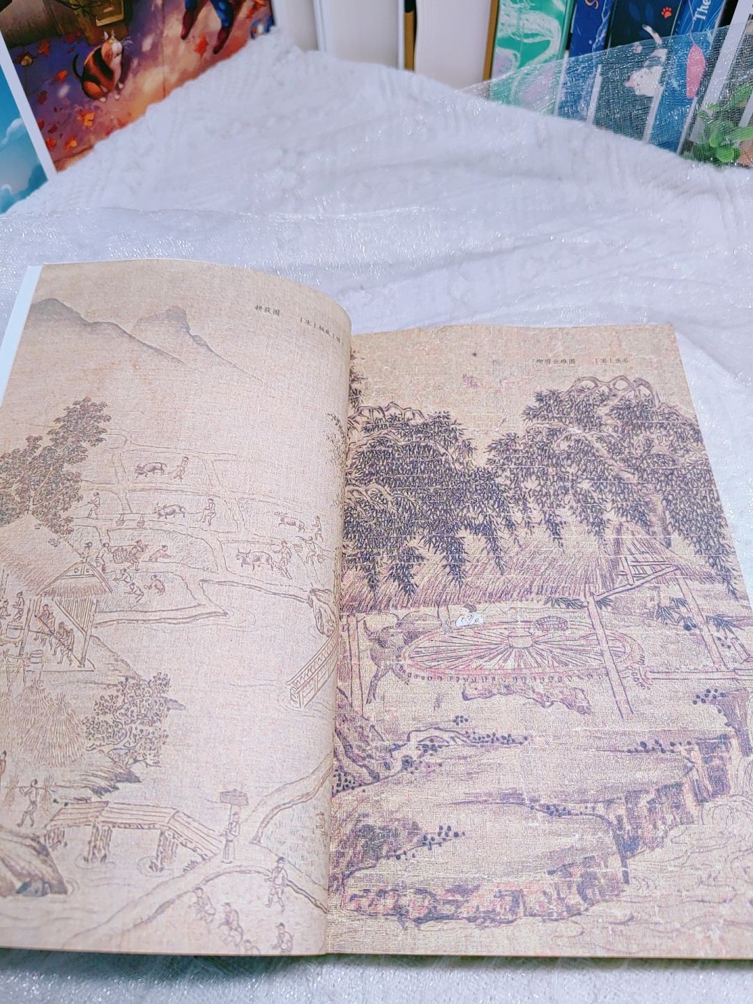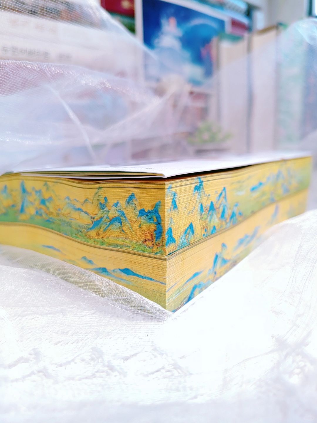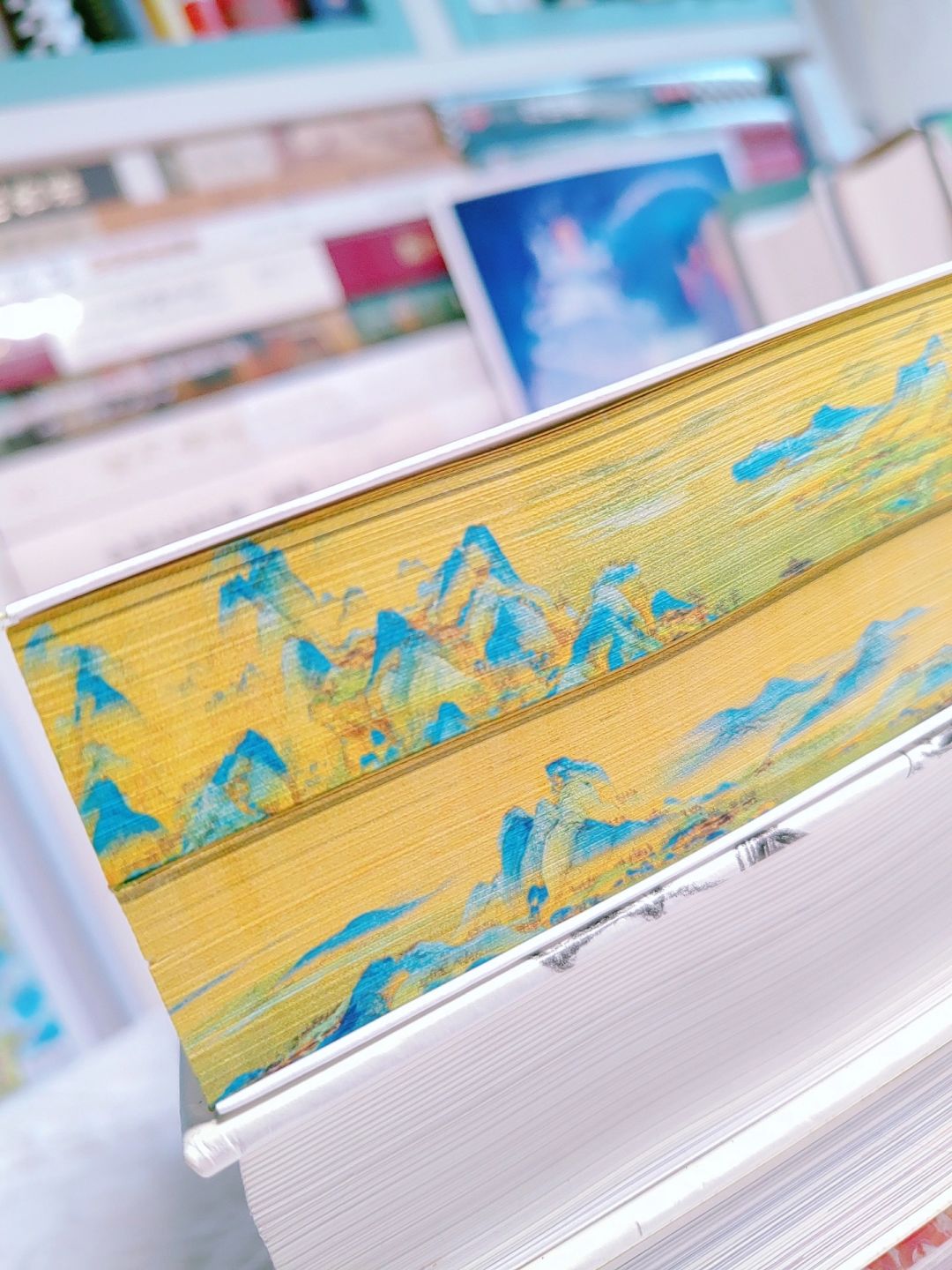 北宋王希孟创作的《千里江山图》绢本设色画为本书的三面刷边,只一眼,便摄人心魄。烟波浩渺、层峦起伏中渔村野市、水榭亭台掩映其间,动静结合,相映成趣。