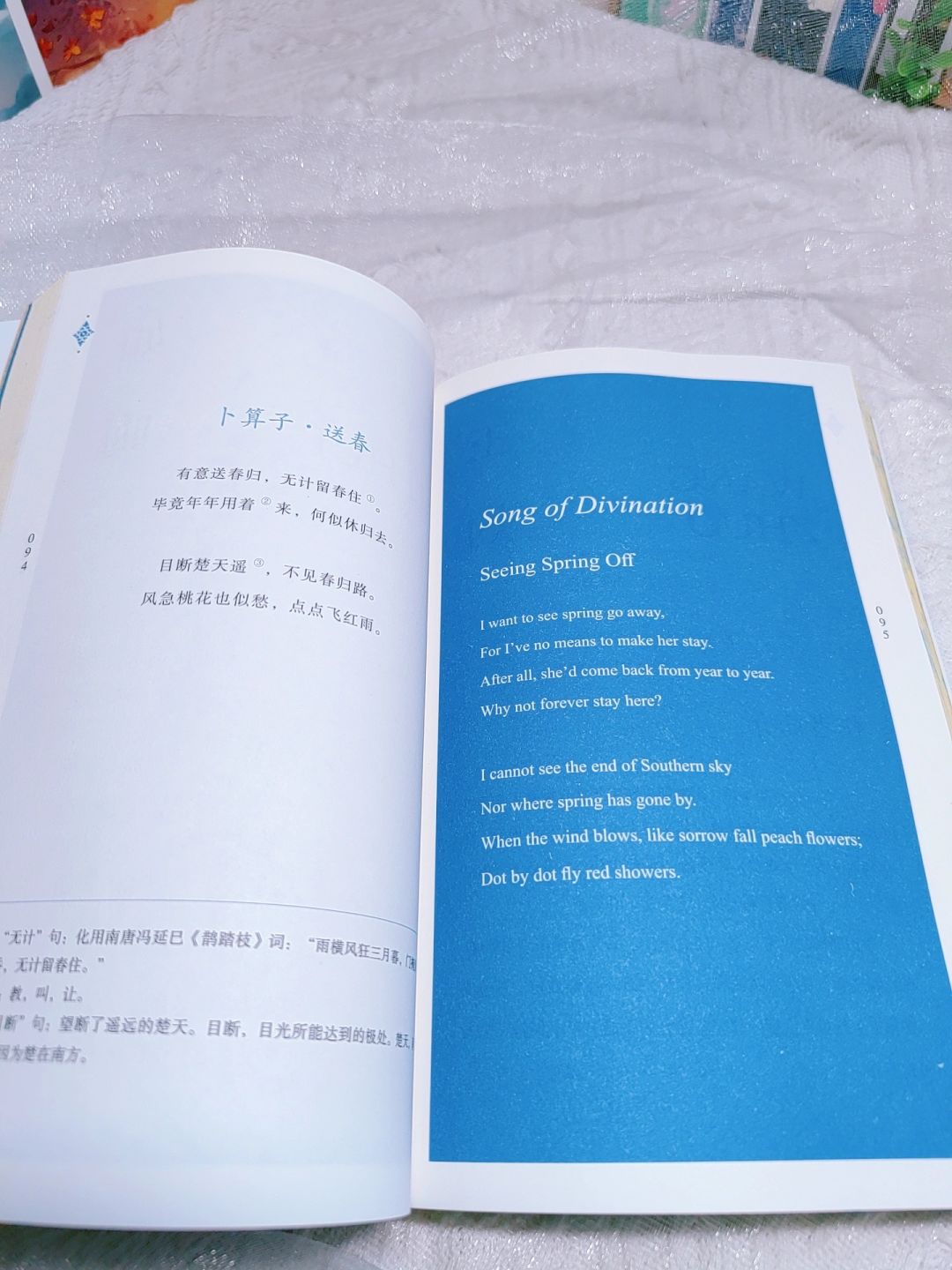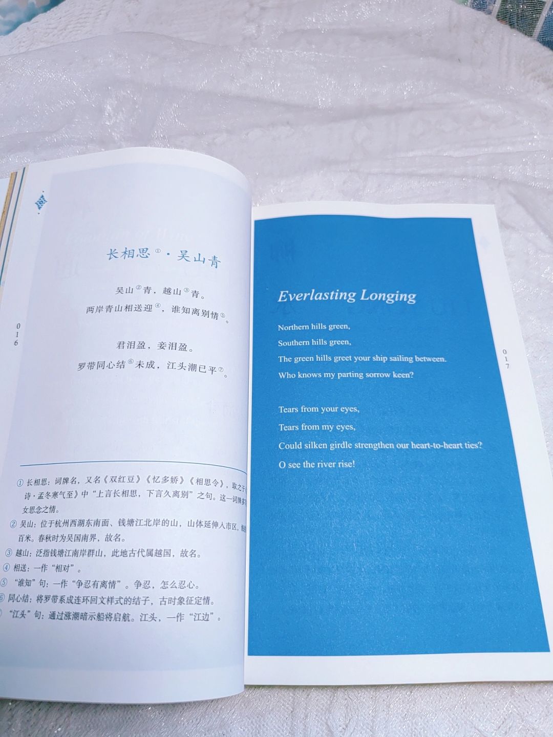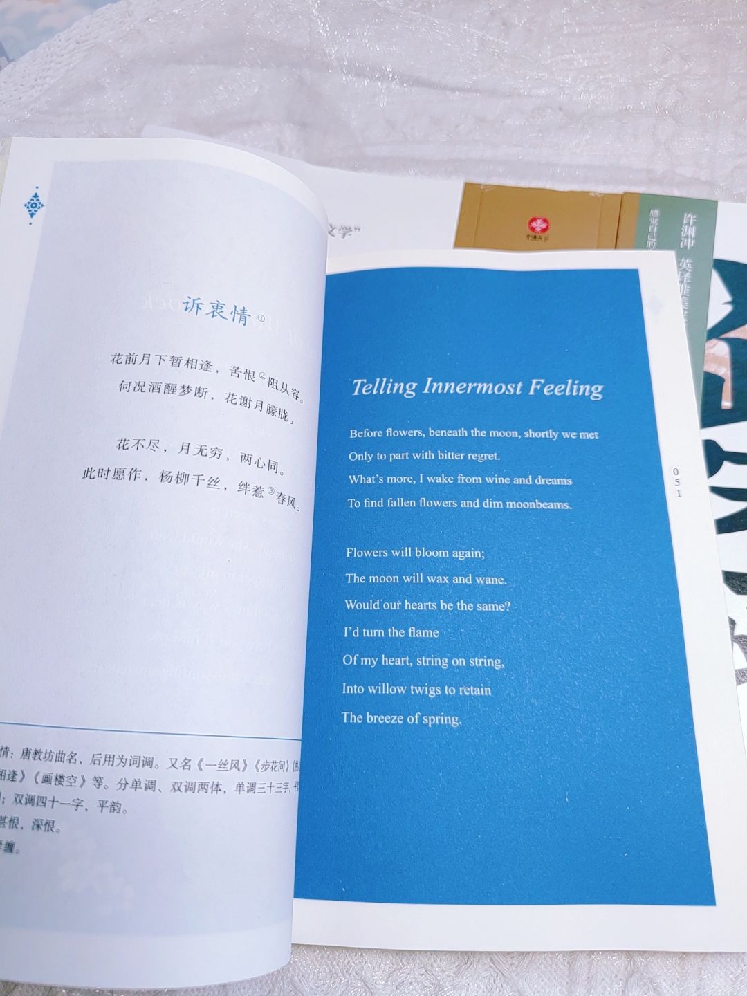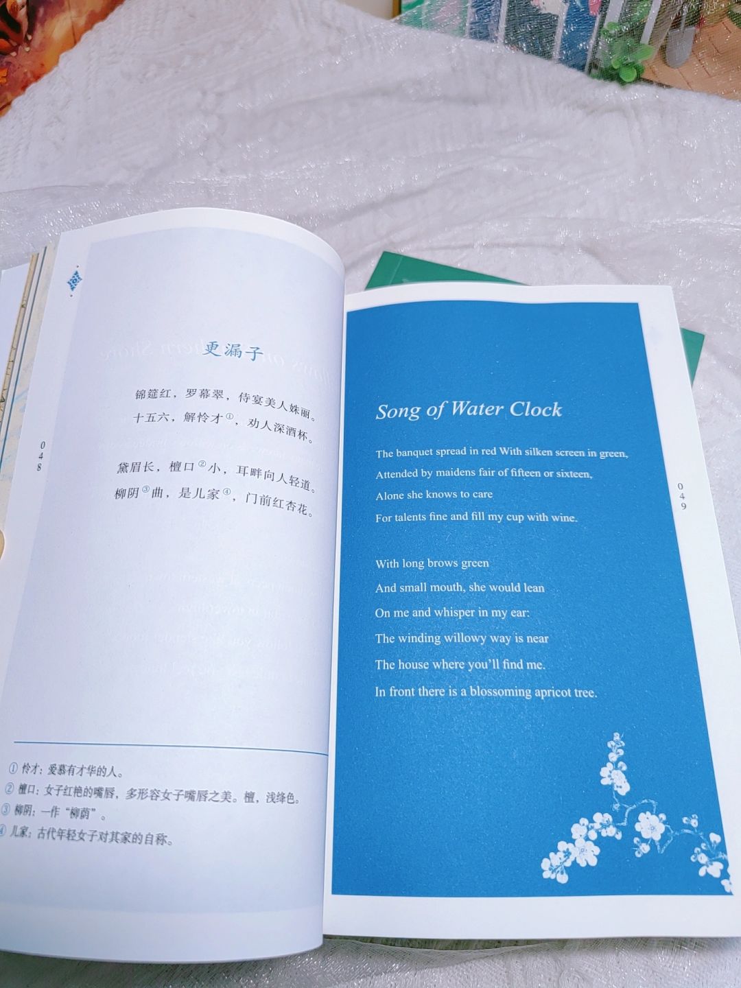 全书用英汉对照的方式排版,专色印刷,英汉对照,同时领略双语的美感。中英双语扫码可听,语言亲切温柔,对读者非常友好。文中加入词人小传,通过对此人生平的介绍,对领略词作的意境大有帮助。