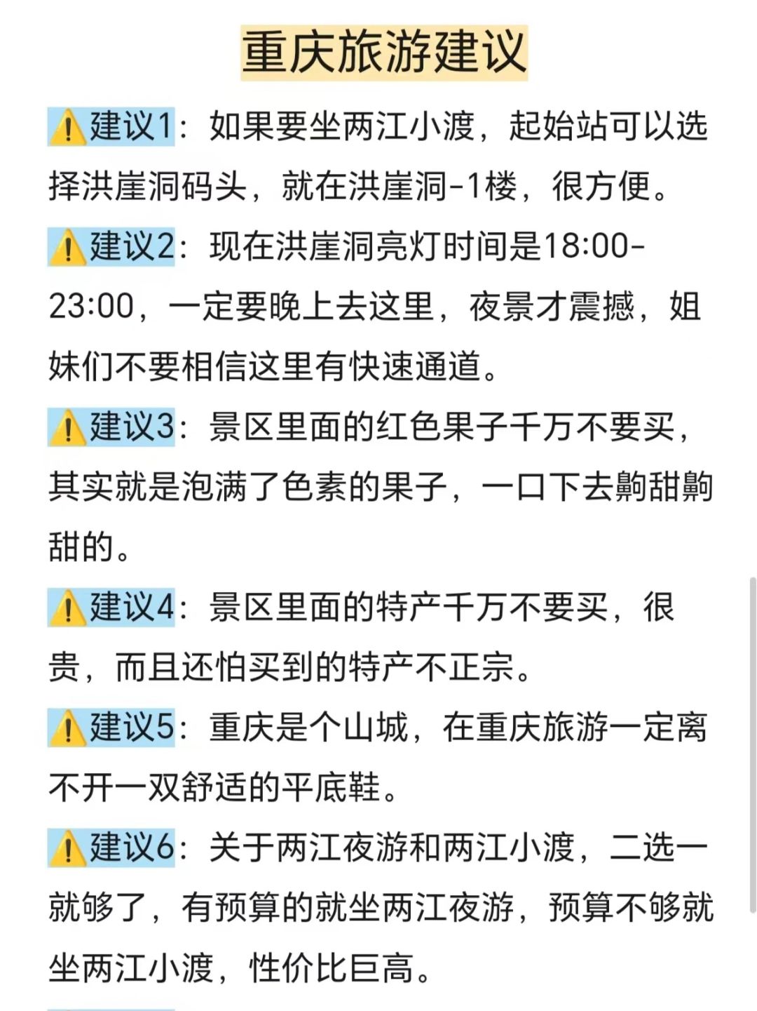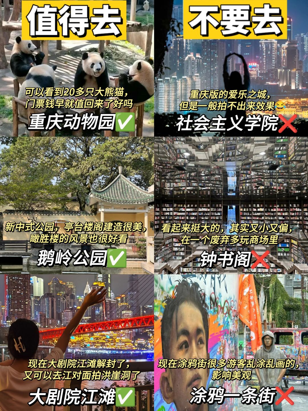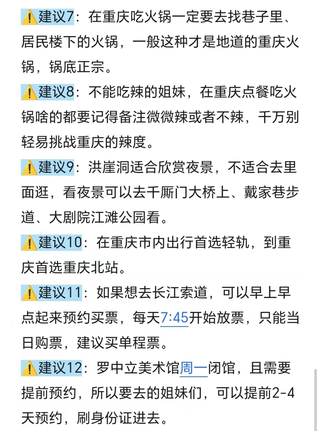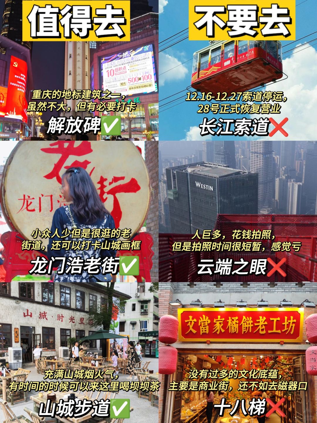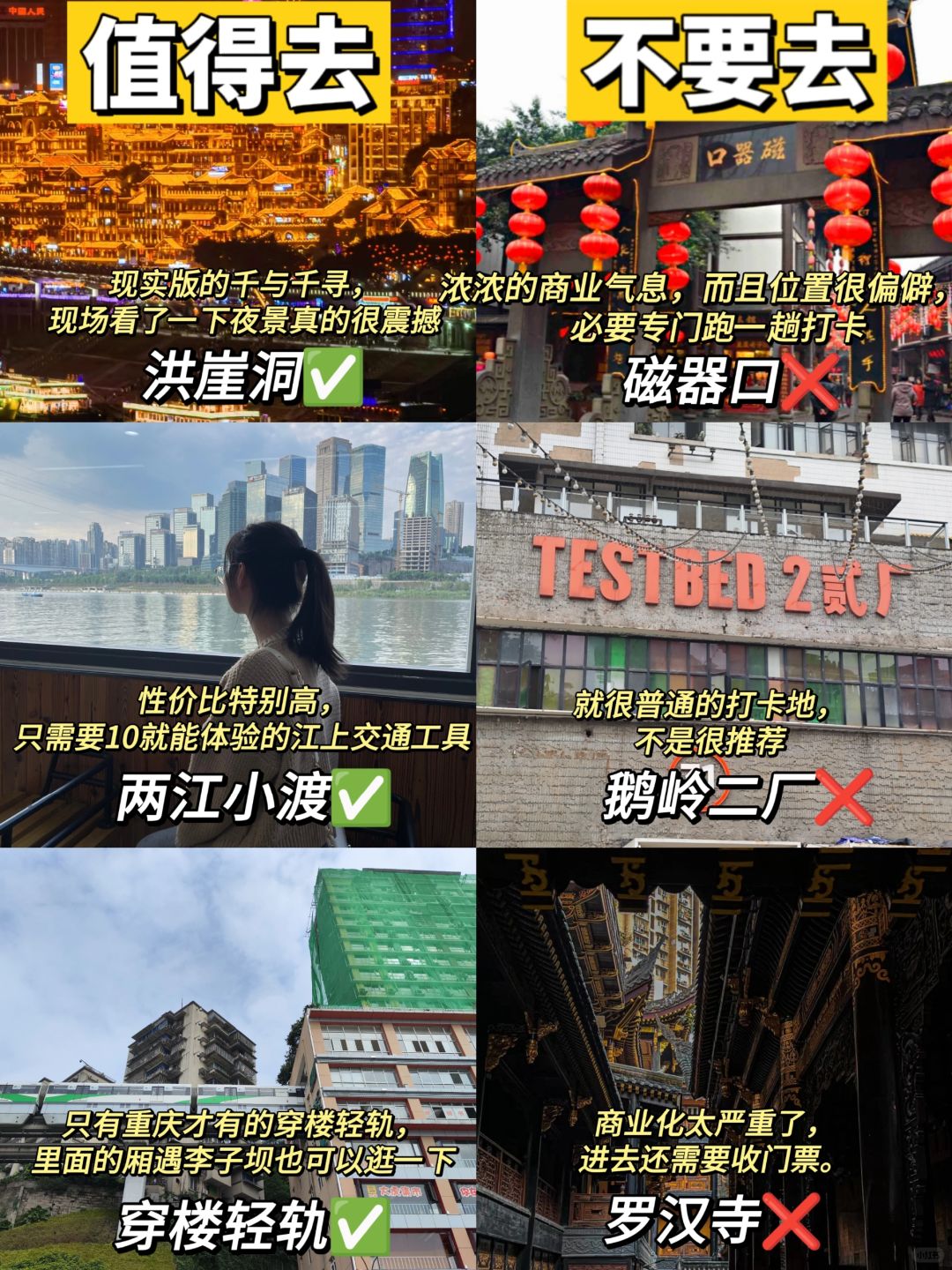 姐妹们,这次趁着元旦节前去了趟重庆,本来以为自己已经做了很多攻略了,结果没想到还是踩了很多雷😭,这里我根据我自己的经验总结了一些✅该去和❌不该去的景点,还有一些✅好吃的美食分享,还有一些✅住宿、✅交通的干货分享~