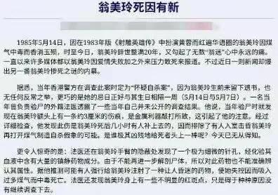 平台推荐一个话题给我(图2)[黑线],然后发现,原来爆料过翁美玲未必是自杀,法医检测结果疑点重重。 据说翁美玲当年和彩虹夫妇是邻居,然后听到了彩虹夫妇吵架爆出的秘密……,然后就遭殃了 我看过翁美玲的黄蓉扮相,人家真真是眼大有神,俏皮灵动……可惜了,命不好,遇到恶毒辣鸡