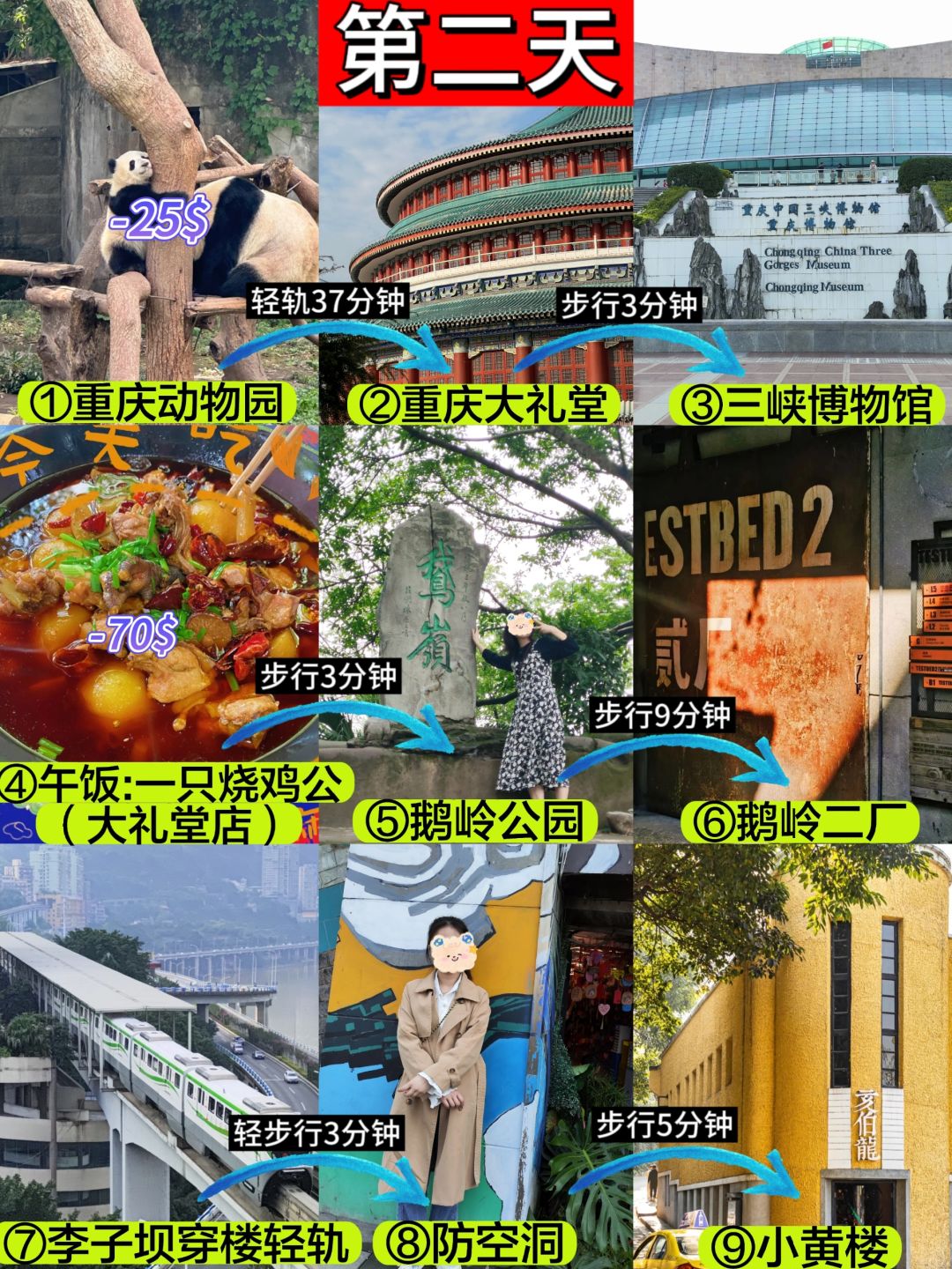 ⚠️注意:这几个景点的顺序不要搞错了,鹅岭公园-鹅岭二厂-李子坝-防空洞-小黄楼这样才是不绕路的下坡路线。