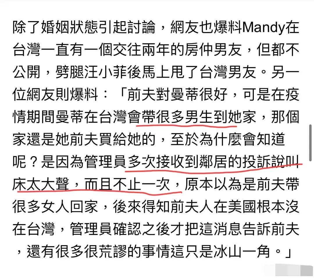 台媒对汪小菲的新女友马女士的爆料中,出现了很多…异性(n+3个) 男1据说是马女士的前夫,2018年在文华酒店举行过婚礼的…【大冤种】 疫情期间(婚内)带很多男生到男1号为她购置的婚房开船…,由于鸣笛太大声被多次投诉到物业管理处【粉丝群男n号[黑线]】 和男1婚姻期间,劈腿一个房仲(房地产中介),也就是男2。但是,每次认识新凯子就甩了房仲男2[黑线]【大备胎】 认识男3汪小菲后,甩了男2房仲[狗头] 汪小菲据说准备了鸽子蛋,准备正式接盘【回收站】