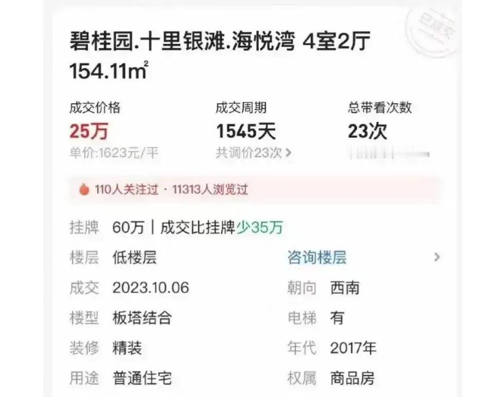 碧桂园十里银滩,154平的房子,60万挂牌,25万成交,单价仅1600元。就是这个价格,成交化了1545天,四年多时间,调了23次价。高峰的2017年,这个盘可以卖到14000元。