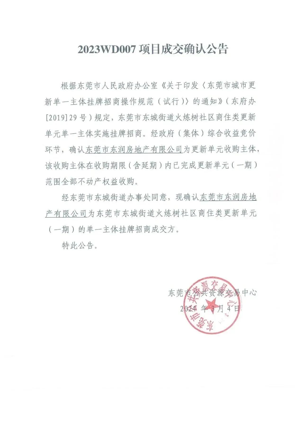 华润旗下东莞市东润房地产有限公司完成东城街道火炼树社区商住类更新单元(一期)不动产权益收购!东莞市东润房地产有限公司为东莞市东城街道火炼树社区商住类更新单元(一期)的单一主体挂牌招商成交方。