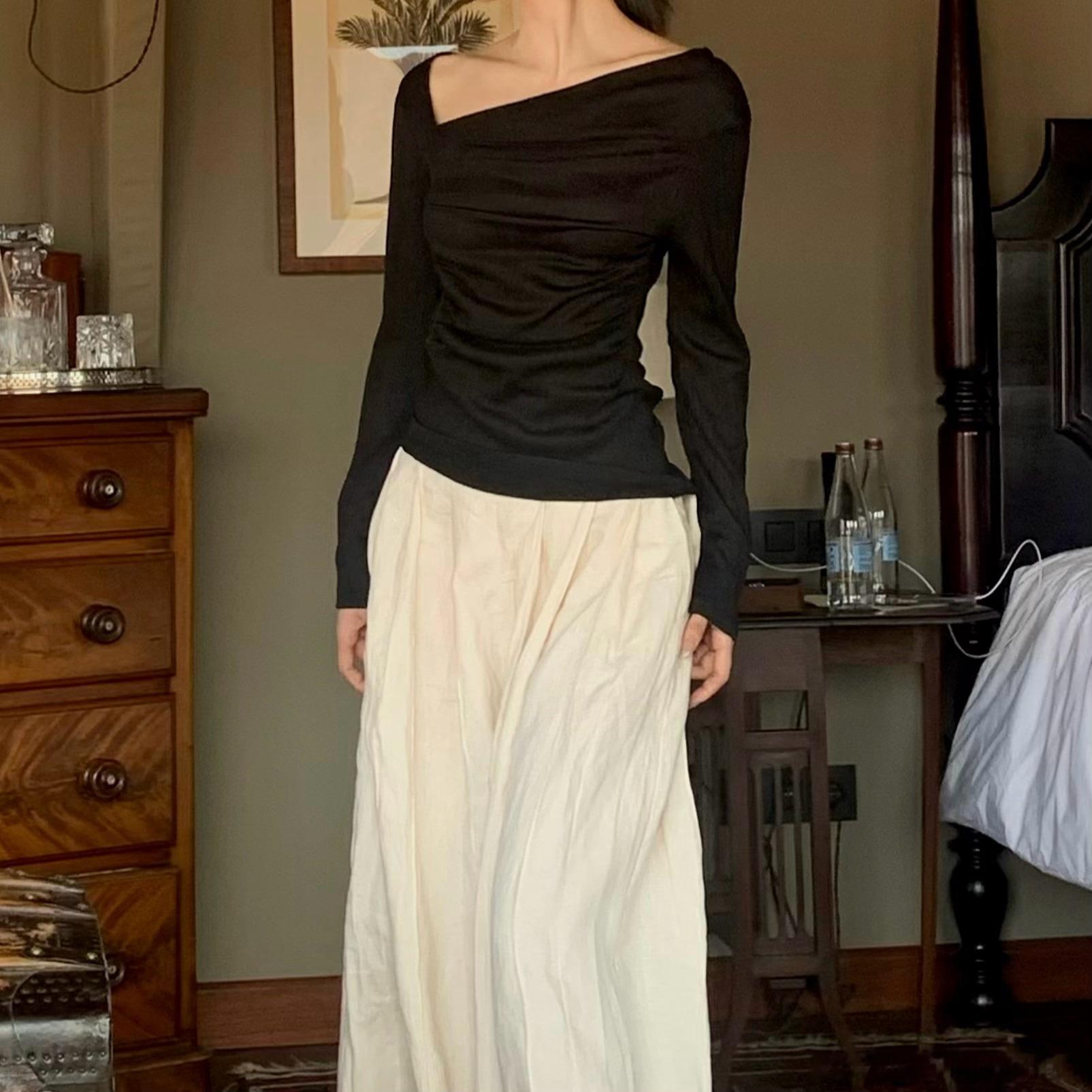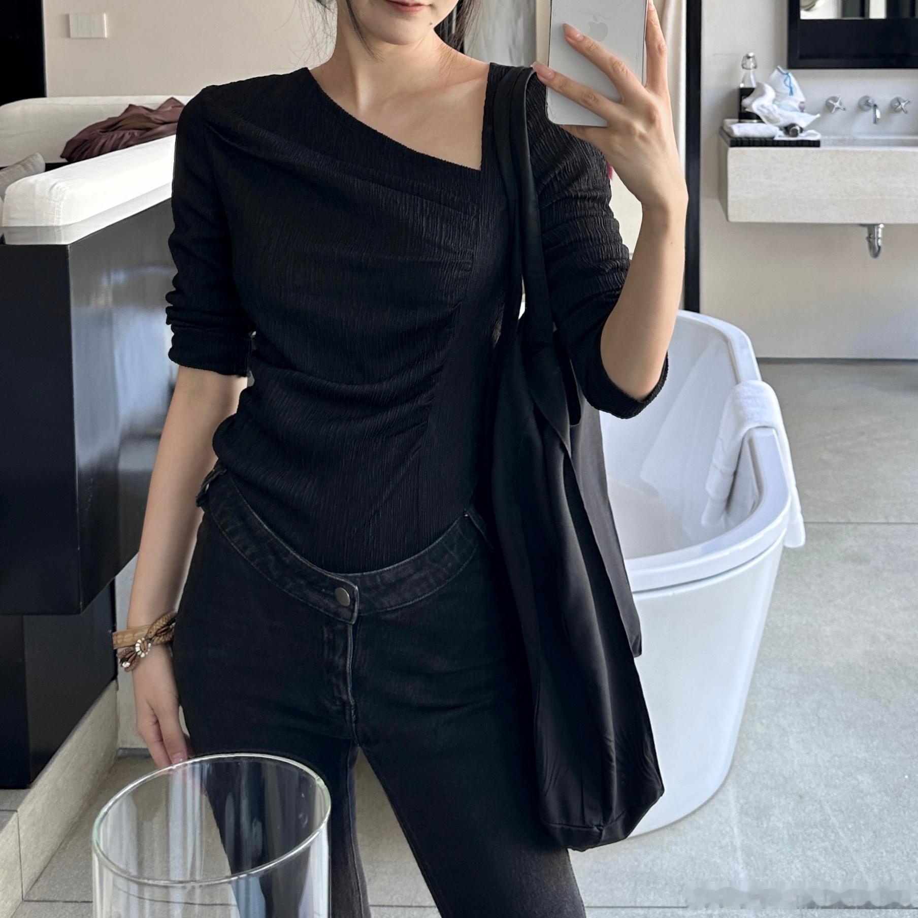 斜领不对称裁剪工艺会比较耗面料 但就是这个刚刚好的倾斜角度 让整件衣服看起来更加有韵味