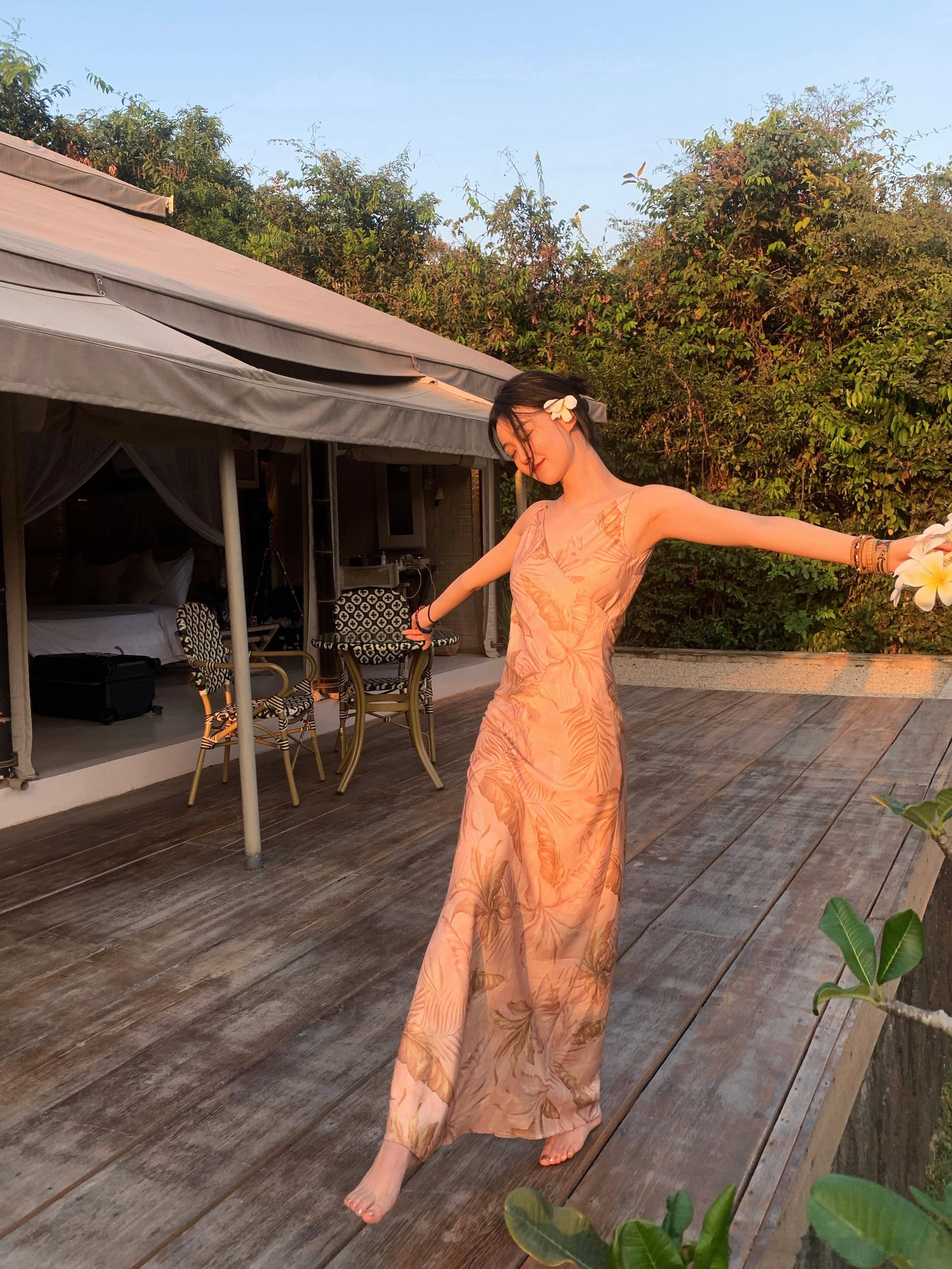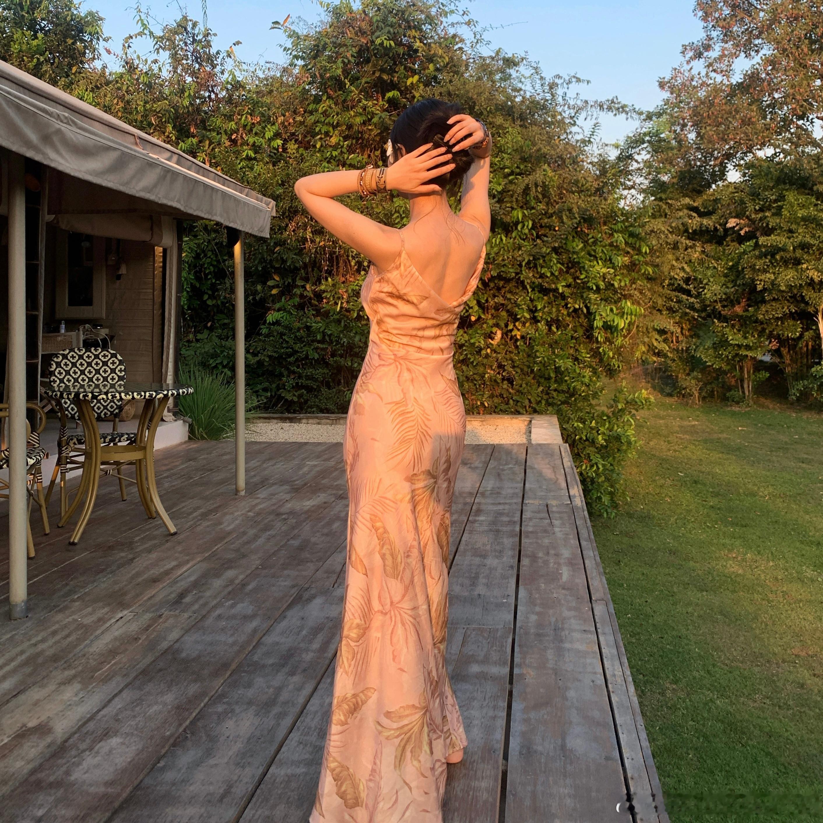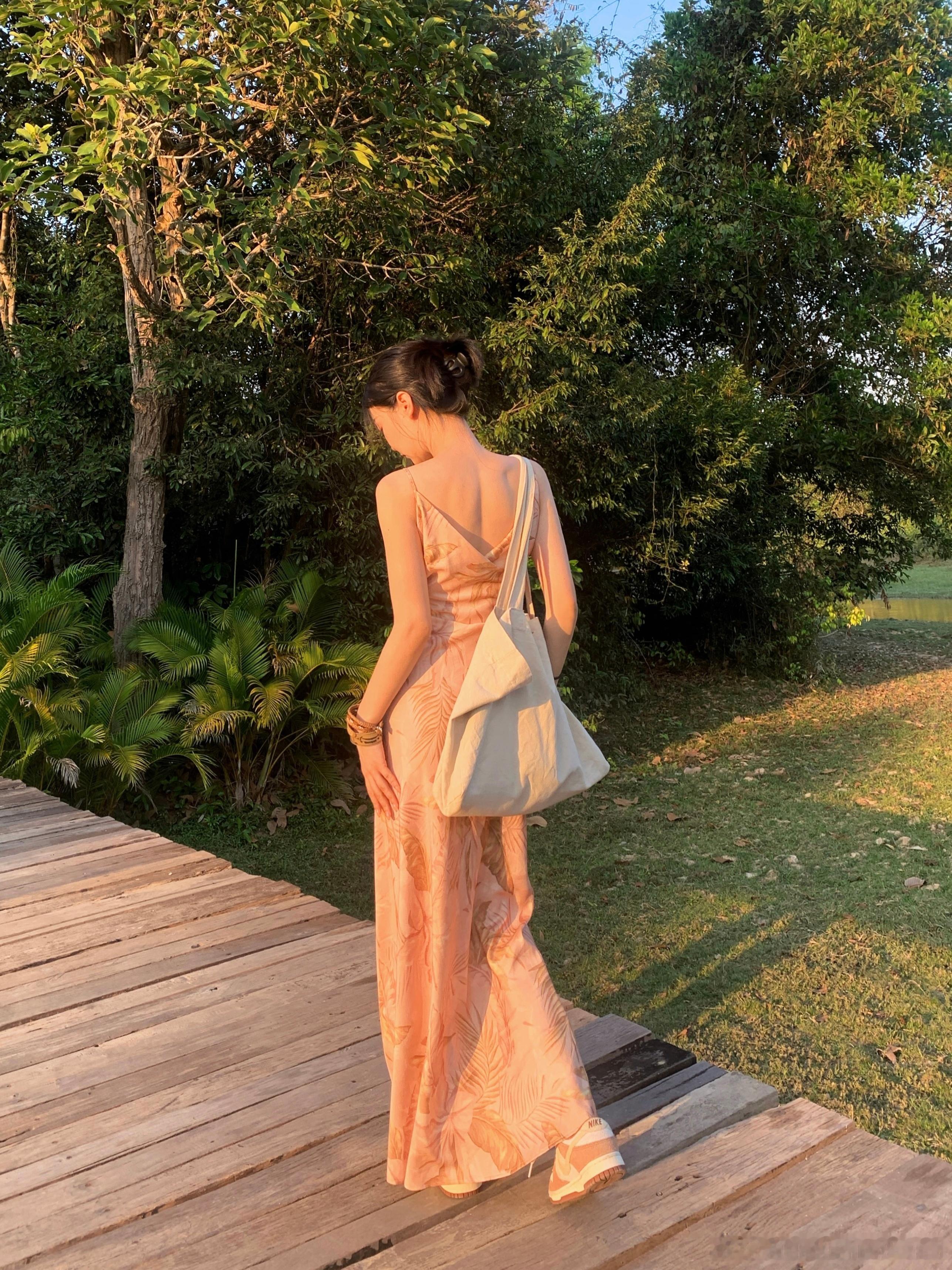 定做的数码印花面料 整体是粉橙色的 偏柔和 虽然是大面积印花 但完全不夸张 柔柔美美的