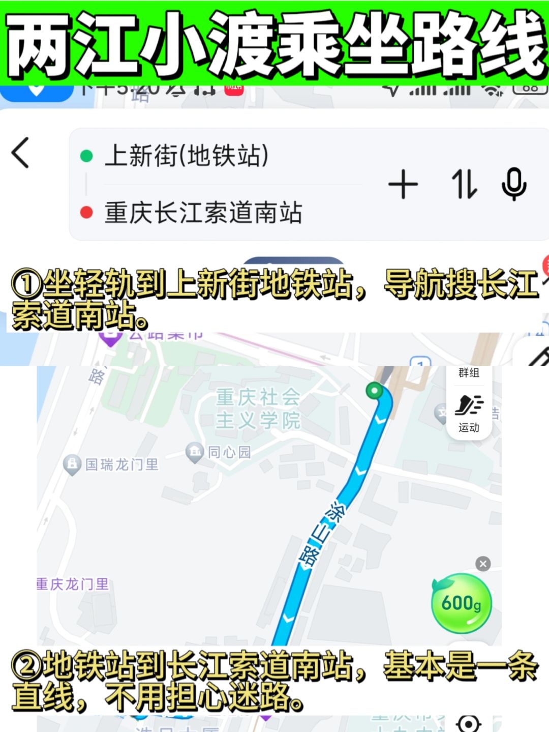 可以先去上新街地铁站,然后步行8分钟➡️长江索道南站,乘索道,➡️长江索道北站,再步行24分钟➡️洪崖洞码头,坐两江小渡➡️弹子石码头,晚上还可以去附近的南滨路钟楼广场看夜景。