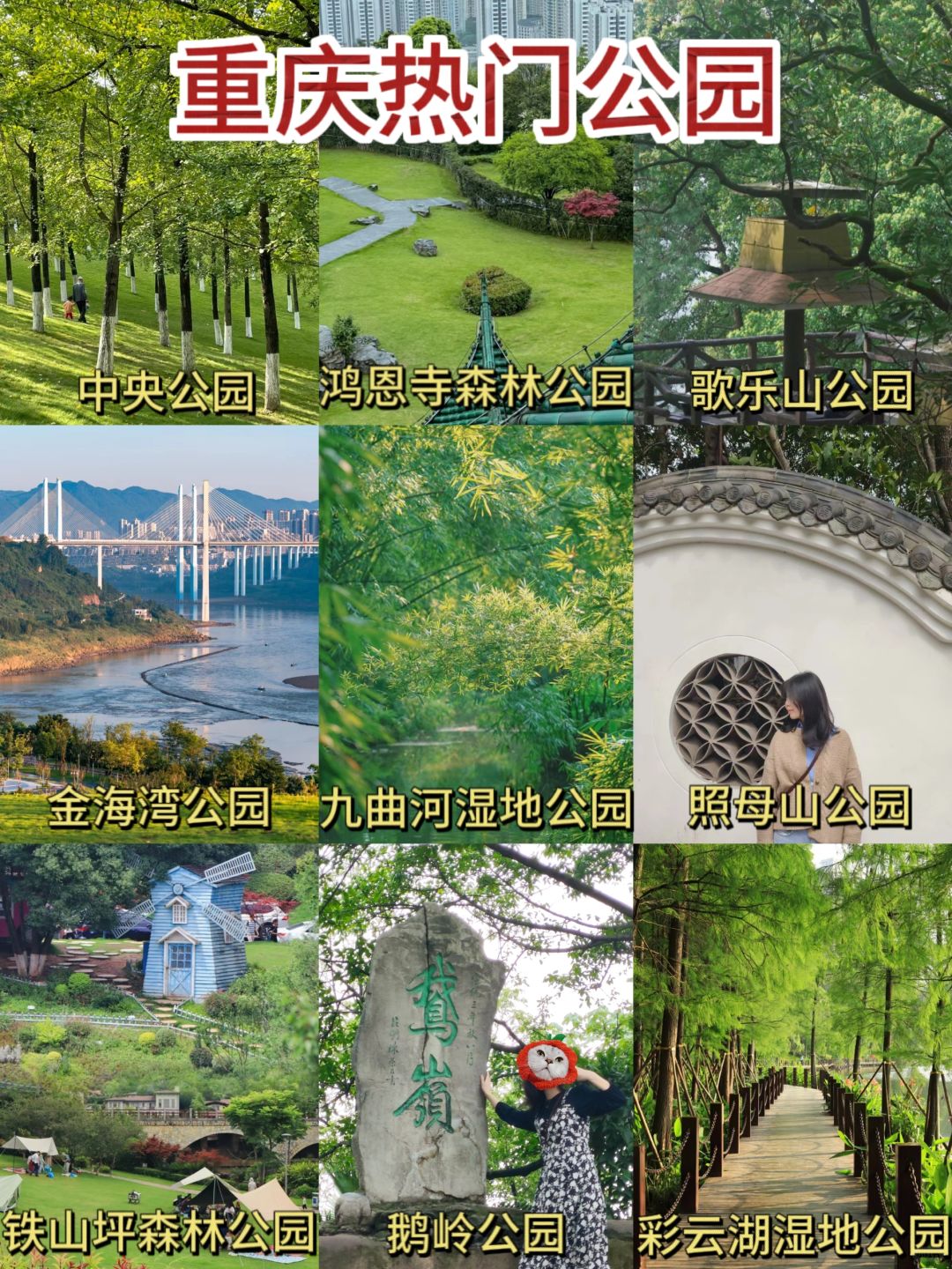 中央公园、歌乐山森林公园、金海湾公园、九曲河湿地公园、照母山公园、铁山坪森林公园、鹅岭公园、彩云湖湿地公园。