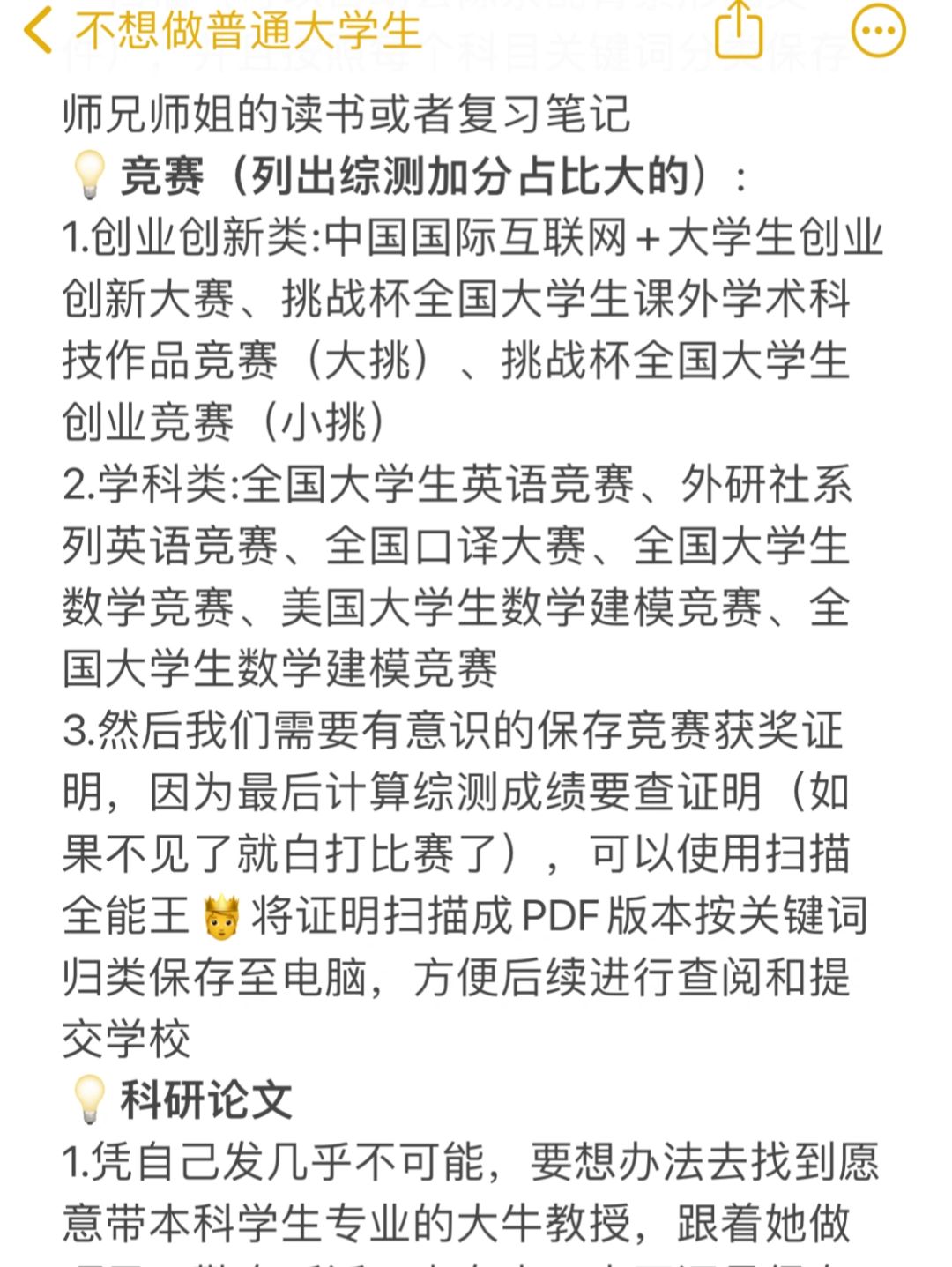 ⭕️⭕️⭕️有一点也要注意就是每次比赛完或者出成绩的时候都要有意识的保存证明,不要等每年综测结算审核的时候再来找。找不到证明就白打比赛了,真的会很可惜。所以每次出证明的时候可以用扫描全能王🚀将图片转成PDF,然后利用不同类别加分竞赛的关键词保存文件,这样第二年加综测会方便很多