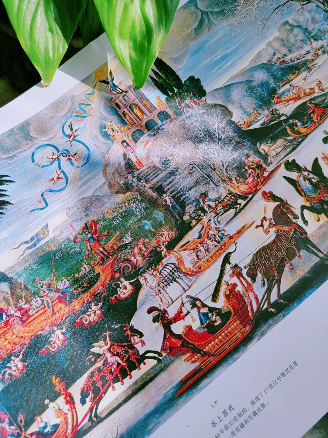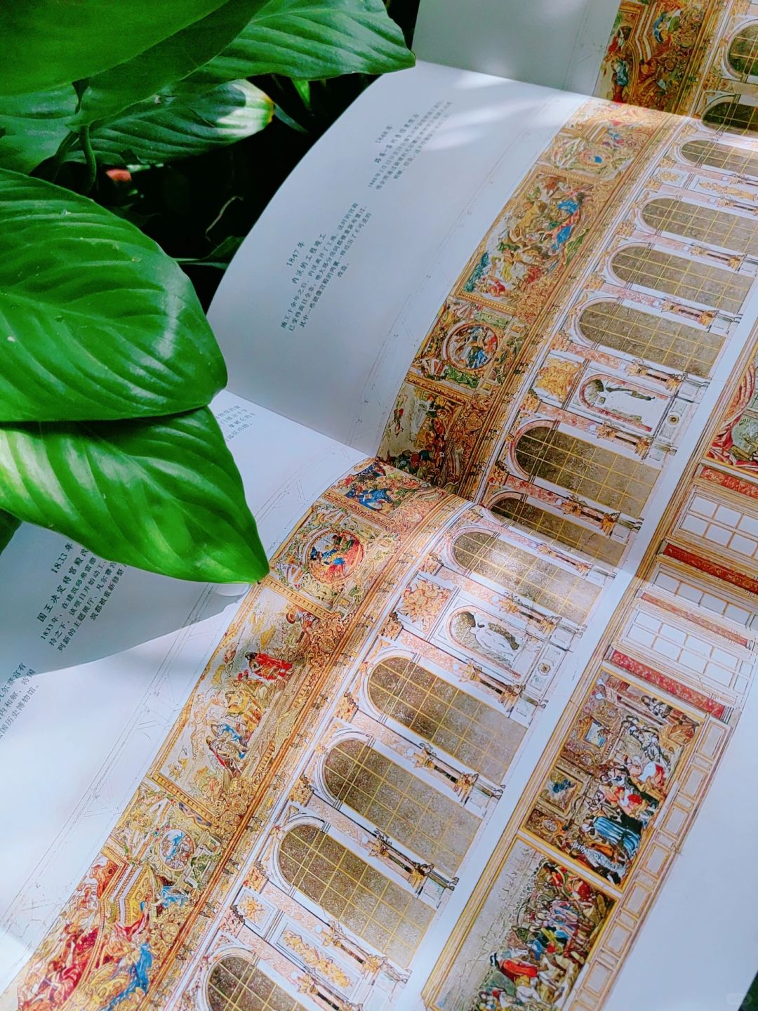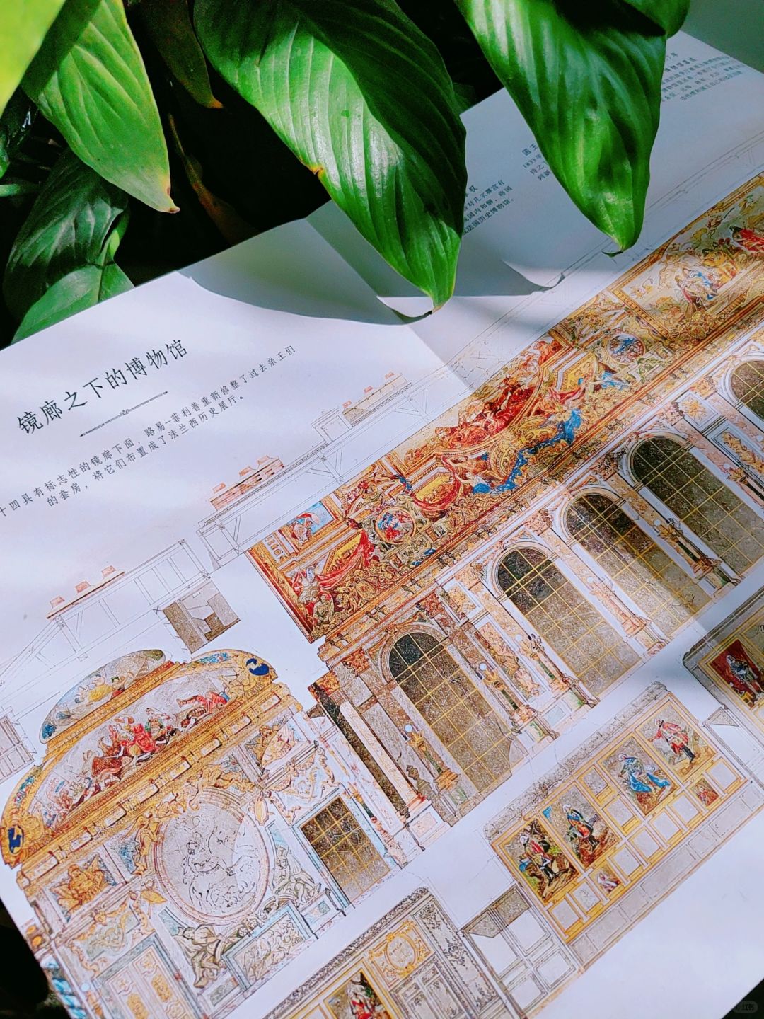 著名的镜廊:近1米的拉页翻开,可以看到经过路易-菲利普重修后的法兰西展厅。这里的标志性是墙壁上镶有17面巨大的镜子,每面镜子由483块镜片组成。在镜面的反射下,天花板上由伦勃朗创作的穹顶壁画无处不在。