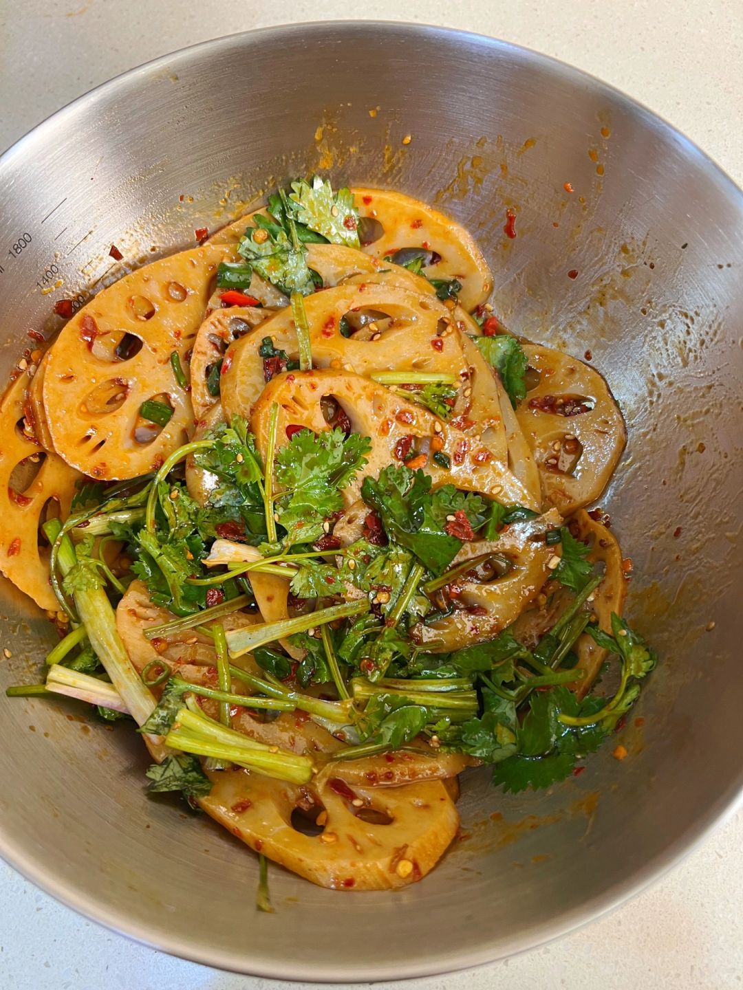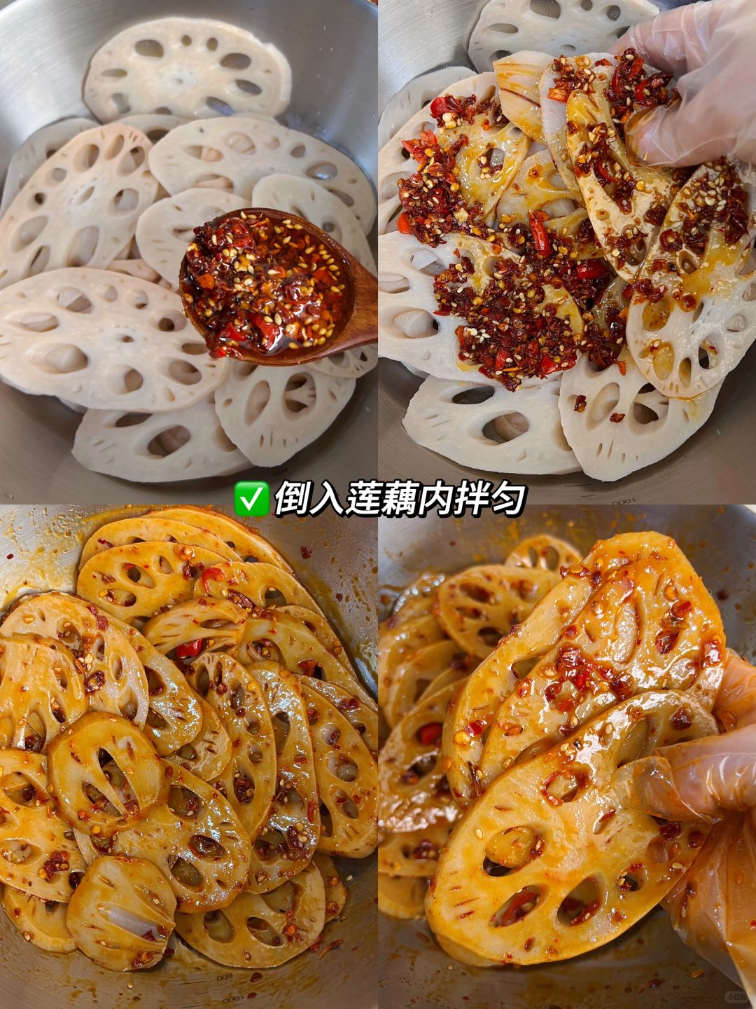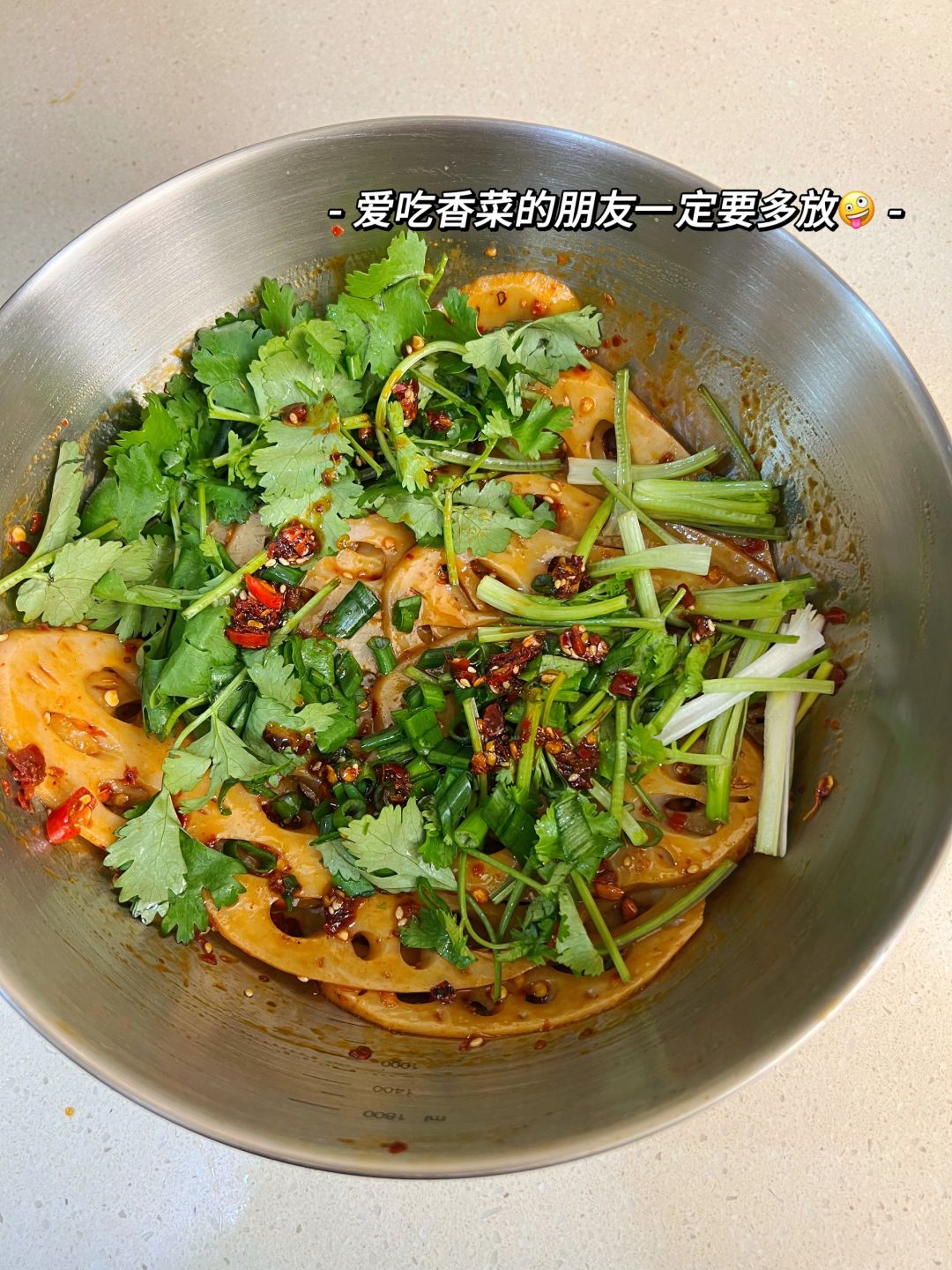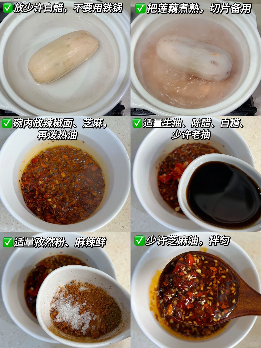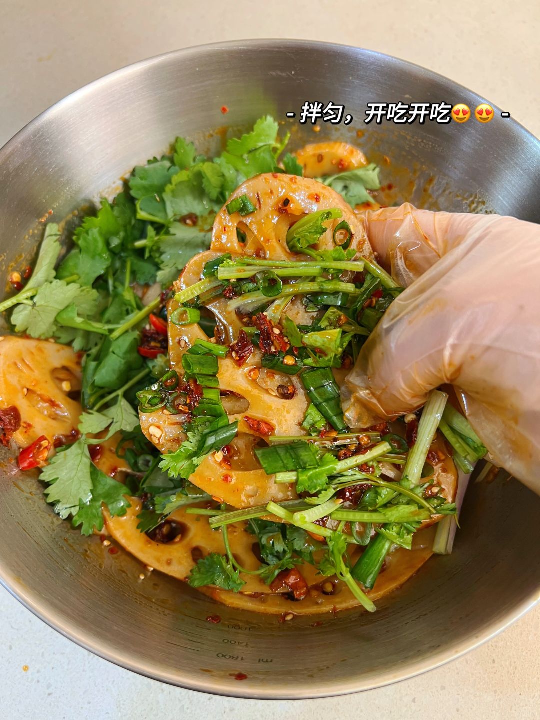 我可太爱吃莲藕啦,第二次分享这个做法了,这个小凉菜真的一定要试下,巨好吃[暗中观察R][暗中观察R] 🍀食材:莲藕、小米辣、辣椒面、香菜、葱、芝麻; 👇做法: 1、莲藕放少许白醋煮熟,这样莲藕不会发黑,最后不要用铁锅,煮熟后切片备用; 2、碗内放辣椒面、芝麻,泼热油,放适量生抽、陈醋、白糖、一点点老抽、孜然粉、麻辣鲜、芝麻油拌匀,再倒入莲藕内拌匀即可(还可以放香菜葱段会更好吃);