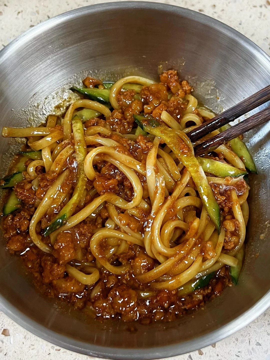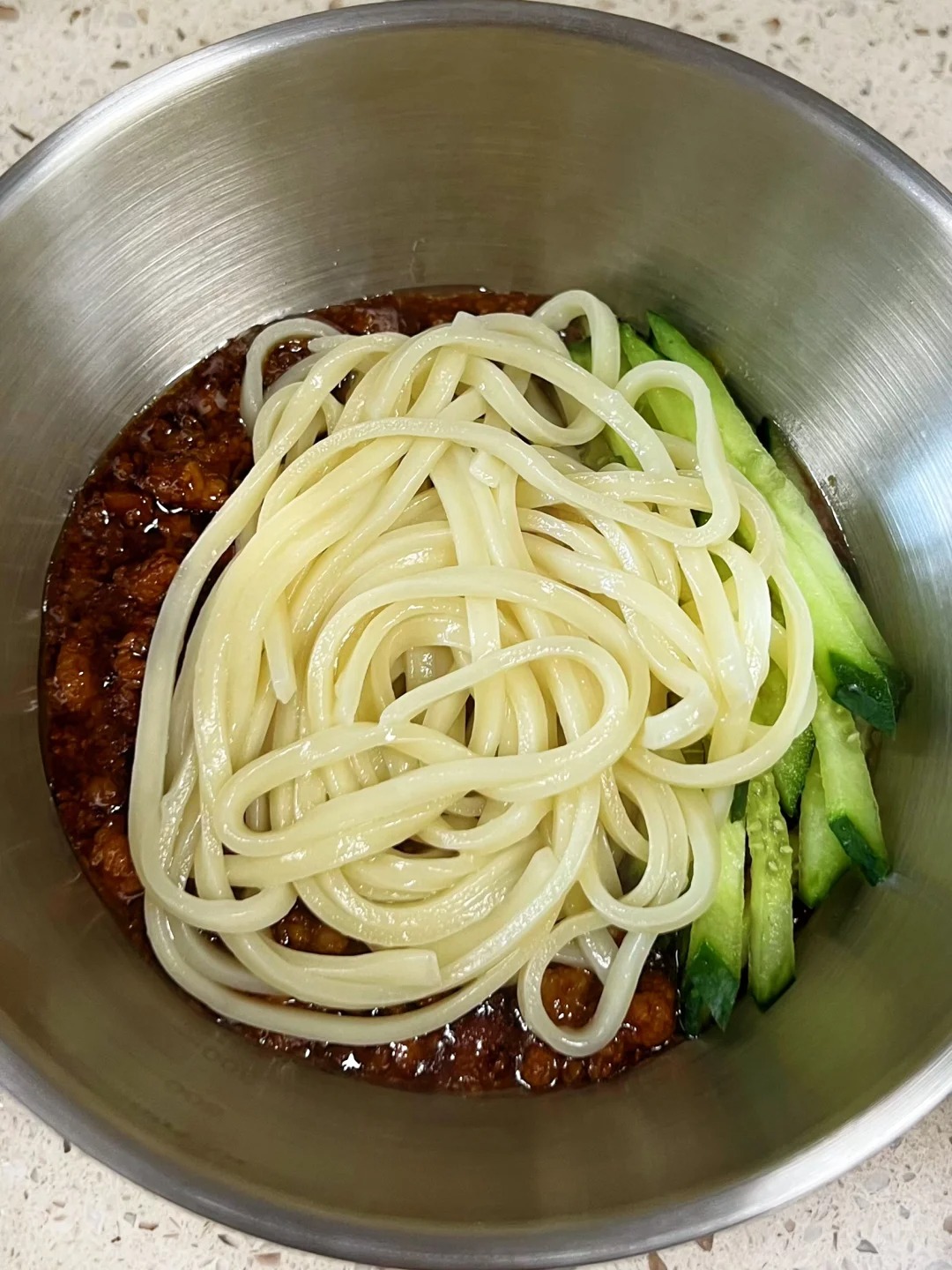 巨巨巨…巨好吃,求你们去做!! 家庭版炸酱面,浓郁的肉酱裹满每一根面条,香到直迷糊!做法简单又美味,都去安排上! 食材: 肉末、葱、蒜、面条、黄瓜 做法: 1️⃣先调一碗酱料汁:两勺生抽、一勺老抽、一勺蚝油、一勺黄豆酱、一勺甜面酱、一勺白糖,搅拌均匀备用 2️⃣油热下肉末,炒至变色,放入葱花、蒜末,倒入调 好的料汁,翻炒出香味,倒入一小碗淀粉水,煮至浓 稠,这样炸酱就做好了 3️⃣锅中水开下面条,煮熟捞出放入炸酱碗中,放上黄瓜丝,拌匀就可以啦