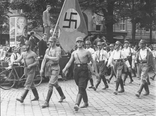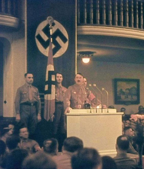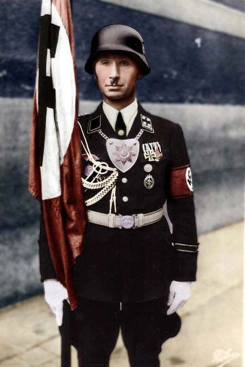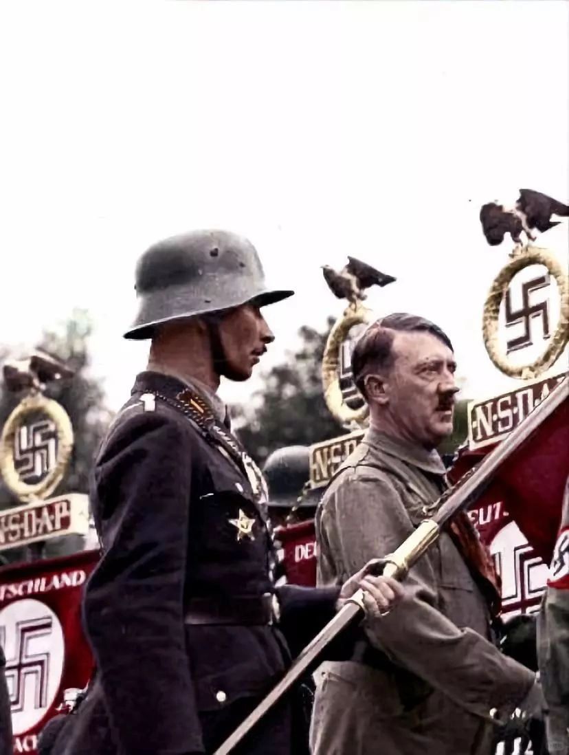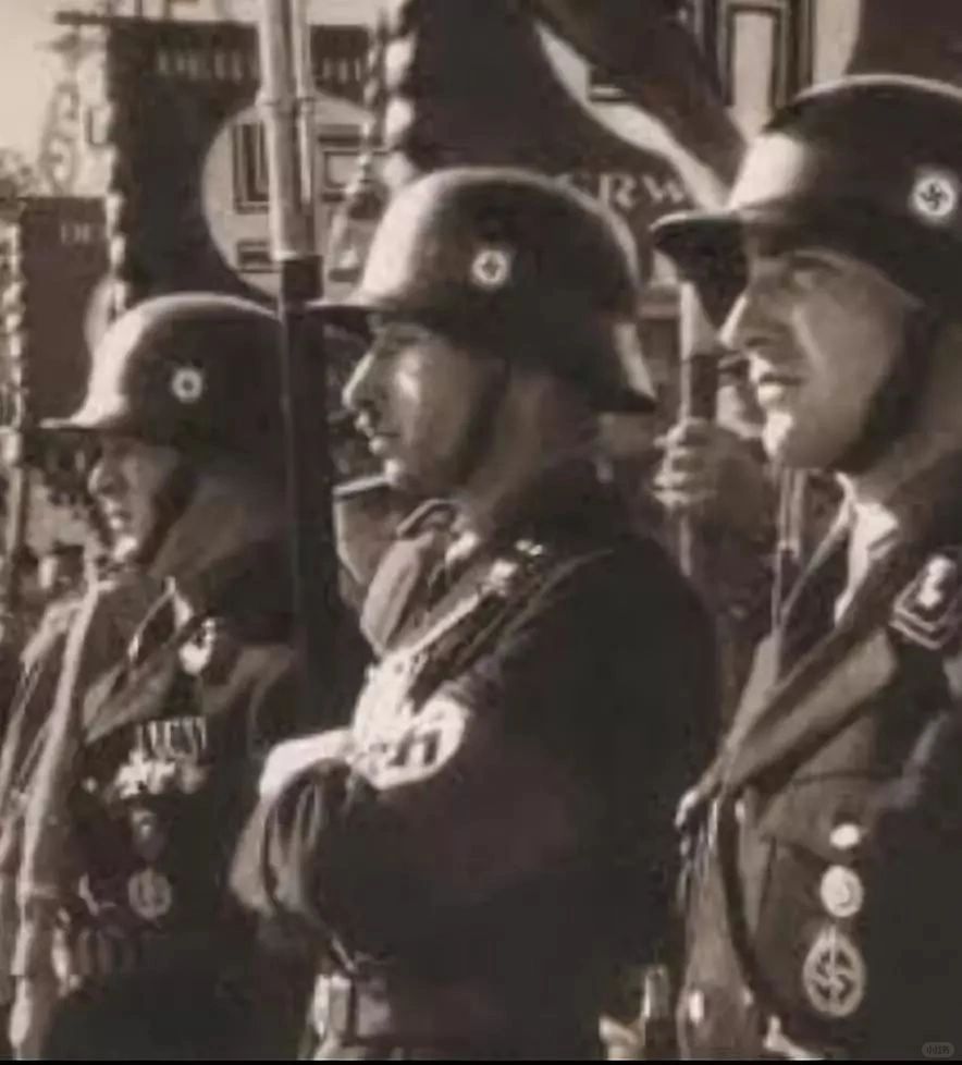 格雷明戈并没有被调往任何前线作战,而是一直作为纳cui的“官方宣传机器”,待在德国本土。每当有阅兵或是检阅仪式时,格雷明格必须到场。别看长相一点都不雅li安,但是常扛着旗子站在小胡子左右,出镜率超高,纳cui拍的纪录片中有他好些个特写镜头。就这样,这位上校一直扛着这面旗帜,一直扛到1945年德国战败。