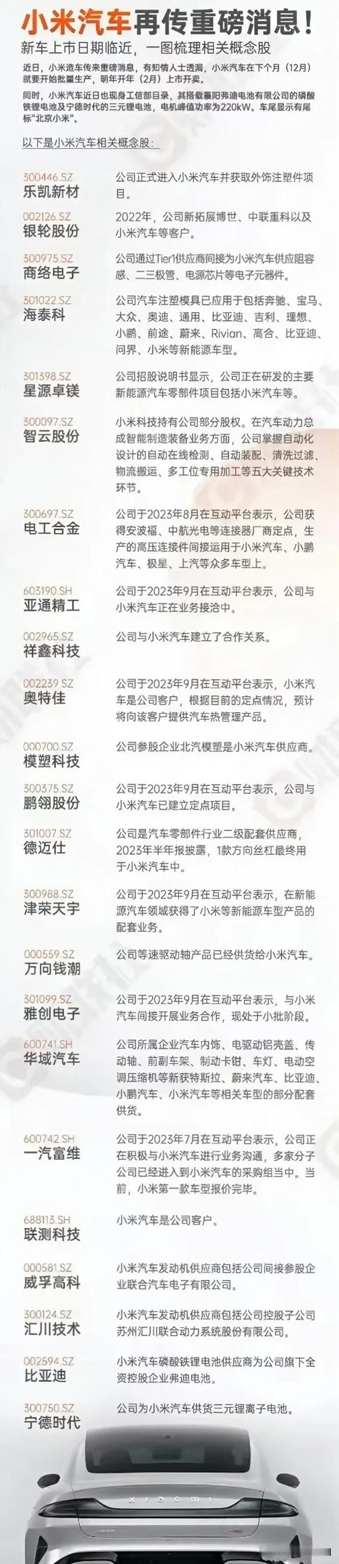 小米汽车即将上市,很多人已经开始围观了。新能源汽车价格战打响。小米汽车或许会取得不错的销售业绩。小米汽车概念龙头一览